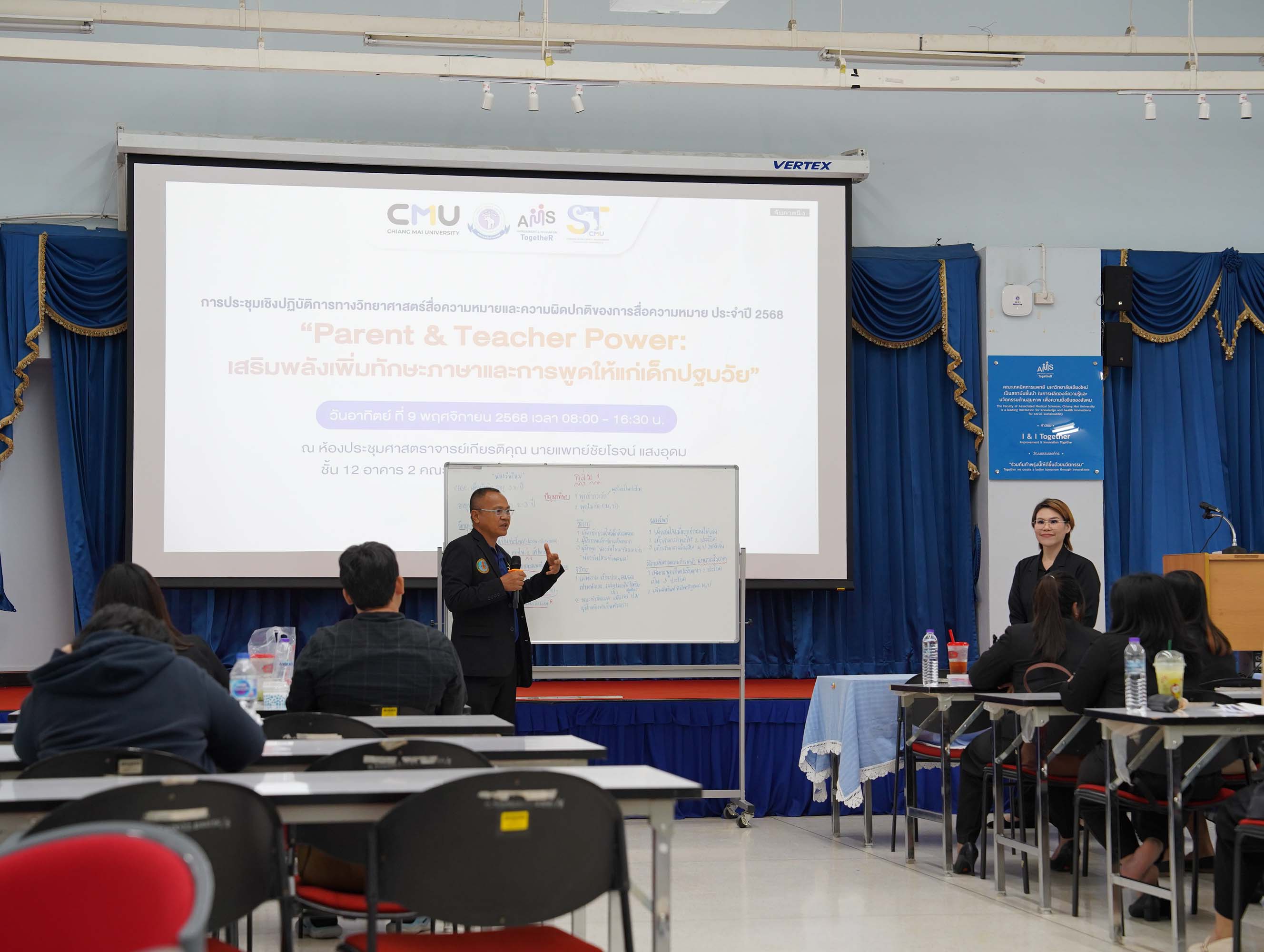 สาขาวิชาวิทยาศาสตร์สื่อความหมายและความผิดปกติของการสื่อความหมาย ภาควิชากิจกรรมบำบัด คณะเทคนิคการแพทย์ มหาวิทยาลัยเชียงใหม่ จัดการประชุมเชิงปฏิบัติการด้านวิทยาศาสตร์สื่อความหมายและความผิดปกติของการสื่อความหมาย ประจำปี 2568 โดยมี ศาสตราจารย์ ดร.สาคร พรประเสริฐ คณบดี เป็นประธาน เพื่อให้ผู้ปกครองและครูปฐมวัย มีความรู้เกี่ยวกับพัฒนาการทางภาษาและการพูด ทักษะ EFs และทักษะการเรียนรู้หนังสือขั้นต้นของเด็กปฐมวัย มีความรู้เกี่ยวกับภาวะพูดช้าและการสังเกตพฤติกรรมภาวะพูดช้า ส่งเสริมพัฒนาการทางภาษาและการพูดในเบื้องต้นที่บ้านและที่โรงเรียนสำหรับเด็กปฐมวัย ณ ห้องประชุมศาสตราจารย์เกียรติคุณนายแพทย์ชัยโรจน์ แสงอุดม ชั้น 12 อาคาร 2 คณะเทคนิคการแพทย์ มหาวิทยาลัยเชียงใหม่ เมื่อวันอาทิตย์ที่ 9 พฤศจิกายน 2568