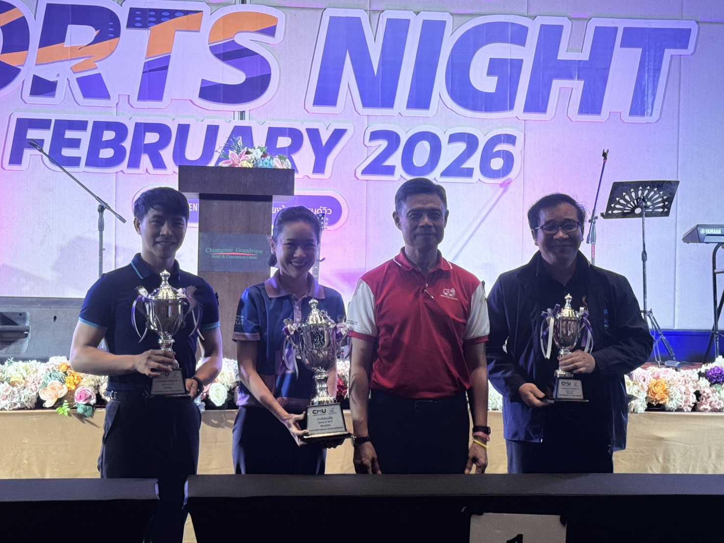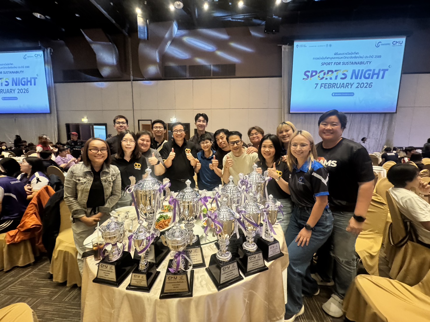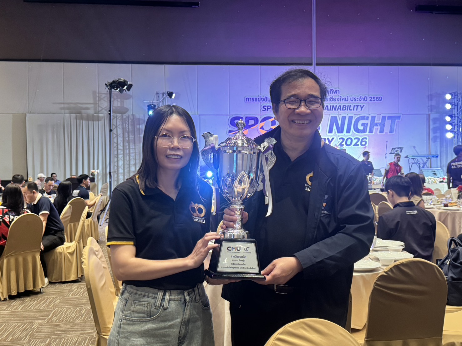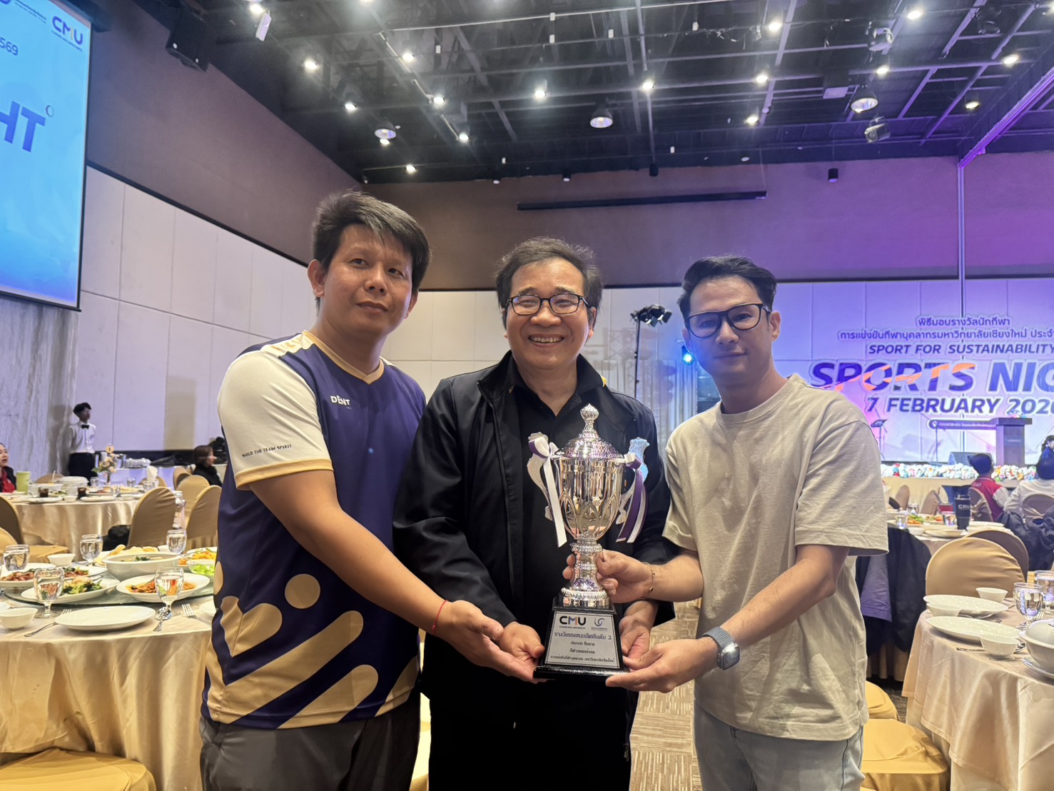 คณะเทคนิคการแพทย์ มหาวิทยาลัยเชียงใหม่ นำโดย ศาสตราจารย์ (เชี่ยวชาญพิเศษ) ดร.สาคร พรประเสริฐ คณบดี ผู้ช่วยศาสตราจารย์ ดร.สุรัชณีย์ พัดงาม ผู้ช่วยคณบดี พร้อมด้วย นักกีฬาบุคลากรคณะเทคนิคการแพทย์ มหาวิทยาลัยเชียงใหม่ ร่วมรับรางวัลในการแข่งขันกีฬาบุคลากรมหาวิทยาลัยเชียงใหม่ ประจำปี 2569 (CMU Sports Night 2026) โดยมี ศาสตราจารย์ ดร.นายแพทย์ พงษ์รักษ์ ศรีบัณฑิตมงคล อธิการบดีมหาวิทยาลัยเชียงใหม่ เป็นประธานในพิธี ณ ห้องประชุมศูนย์ประชุมนานาชาติ โรงแรมเชียงใหม่แกรนด์วิว วันเสาร์ที่ 7 กุมภาพันธ์ 2569