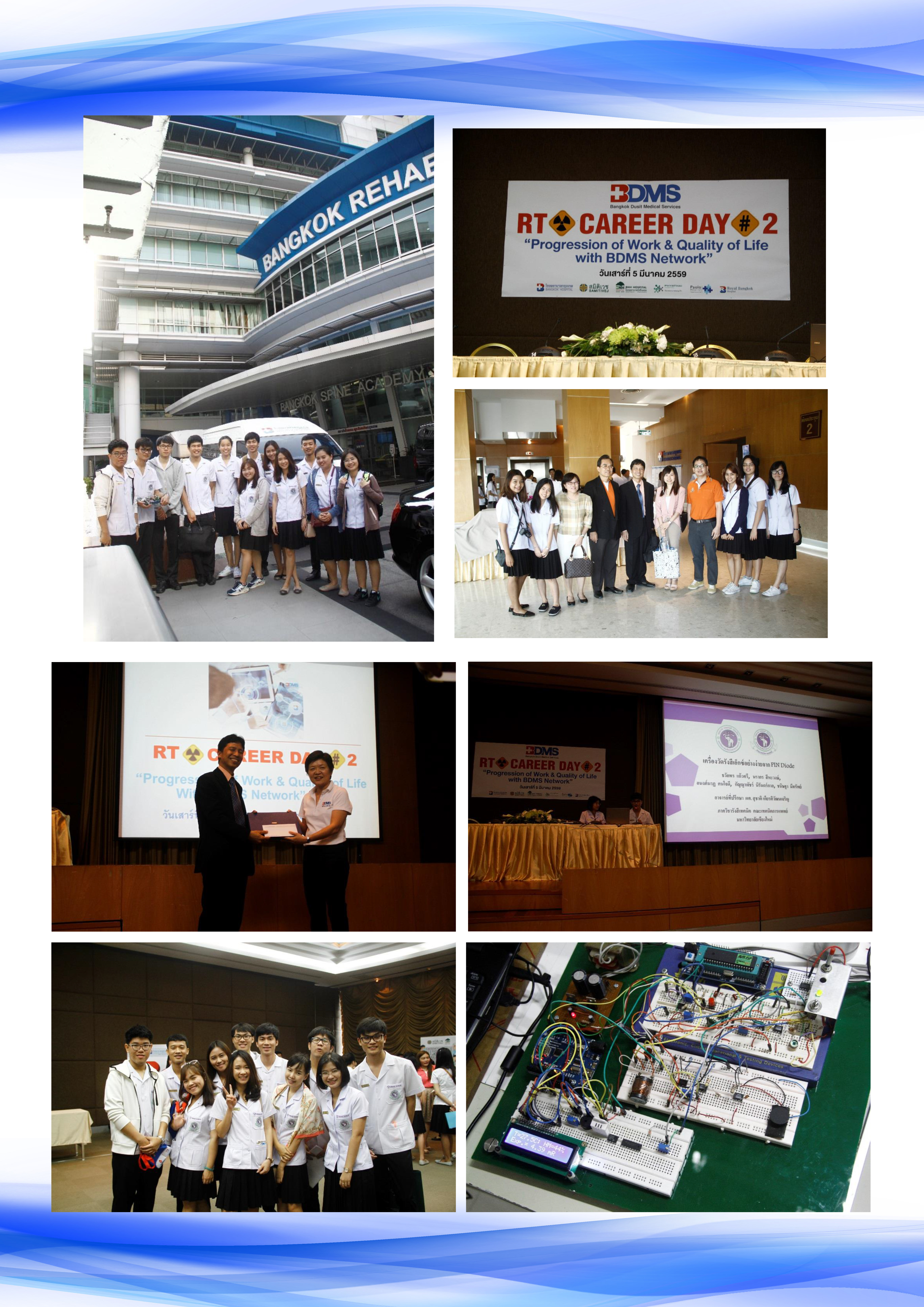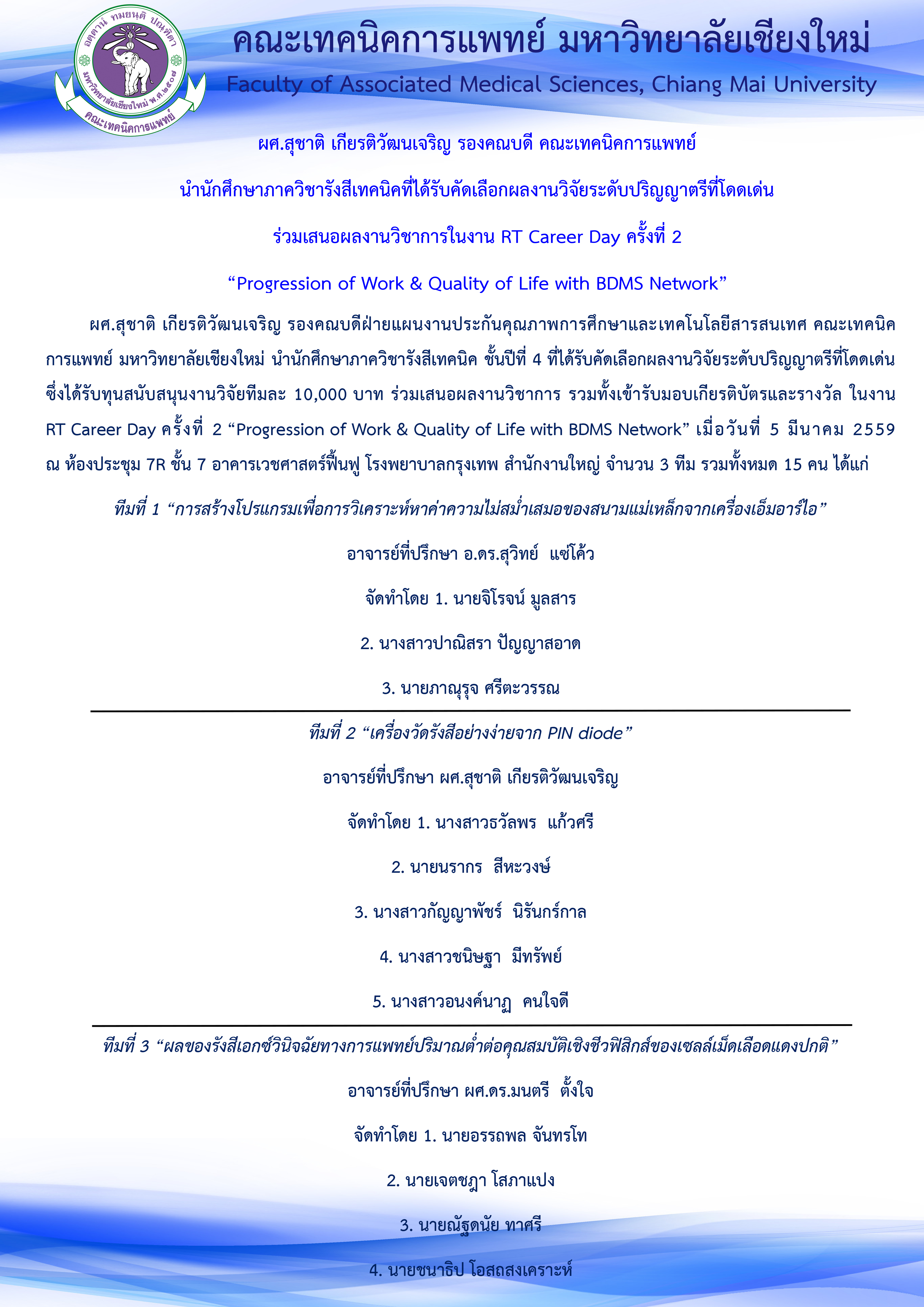 ผศ.สุชาติ เกียรติวัฒนเจริญ รองคณบดีฝ่ายแผนงานประกันคุณภาพการศึกษาและเทคโนโลยีสารสนเทศ คณะเทคนิคการแพทย์ มหาวิทยาลัยเชียงใหม่ นำนักศึกษาภาควิชารังสีเทคนิค ชั้นปีที่ 4 ที่ได้รับคัดเลือกผลงานวิจัยระดับปริญญาตรีที่โดดเด่น ซึ่งได้รับทุนสนับสนุนงานวิจัยทีมละ 10,000 บาท ร่วมเสนอผลงานวิชาการ รวมทั้งเข้ารับมอบเกียรติบัตรและรางวัล ในงาน RT Career Day ครั้งที่ 2 “Progression of Work & Quality of Life with BDMS Network” เมื่อวันที่ 5 มีนาคม 2559 ณ ห้องประชุม 7R ชั้น 7 อาคารเวชศาสตร์ฟื้นฟู โรงพยาบาลกรุงเทพ สำนักงานใหญ่ จำนวน 3 ทีม รวมทั้งหมด 15 คน ได้แก่