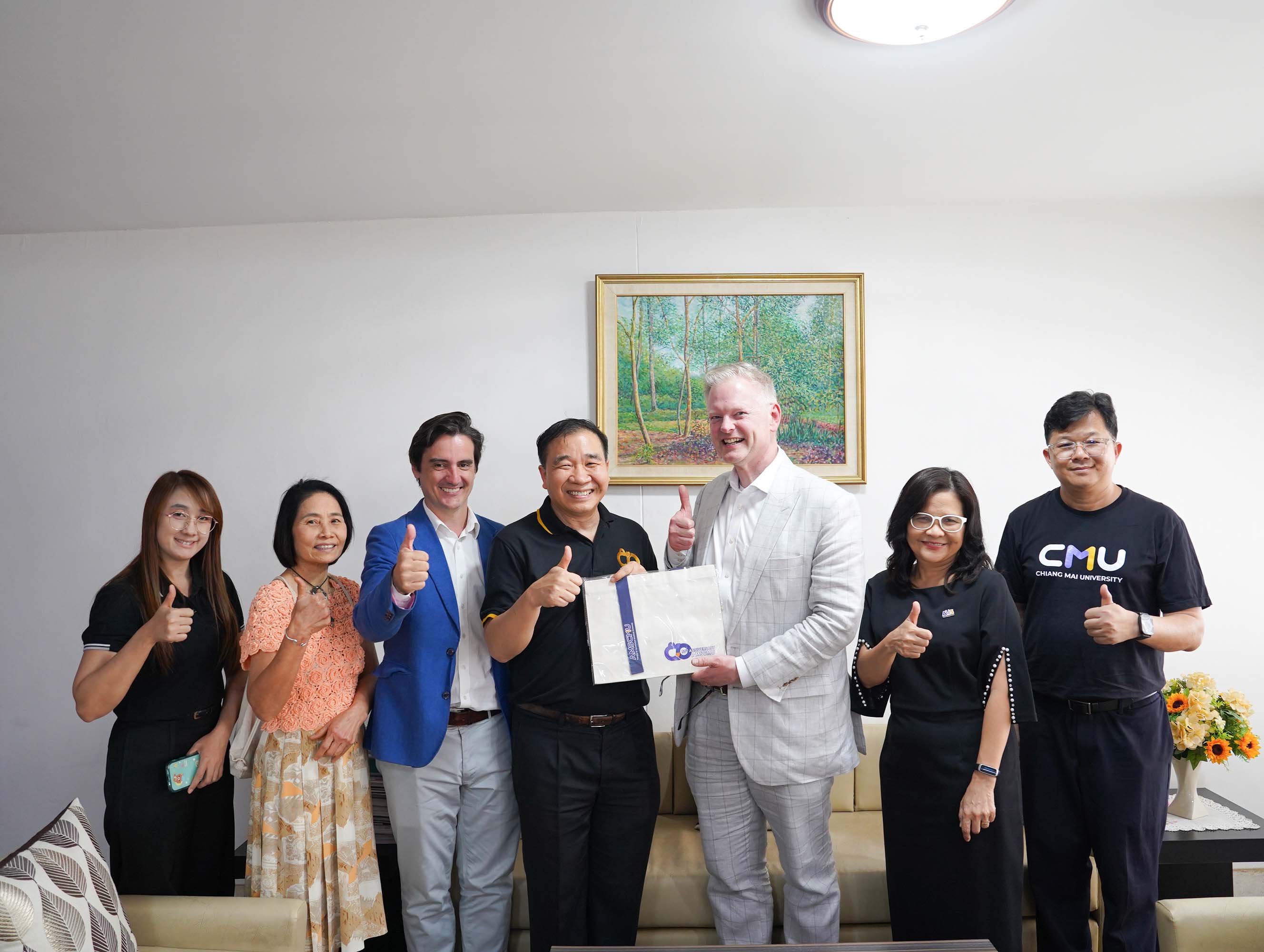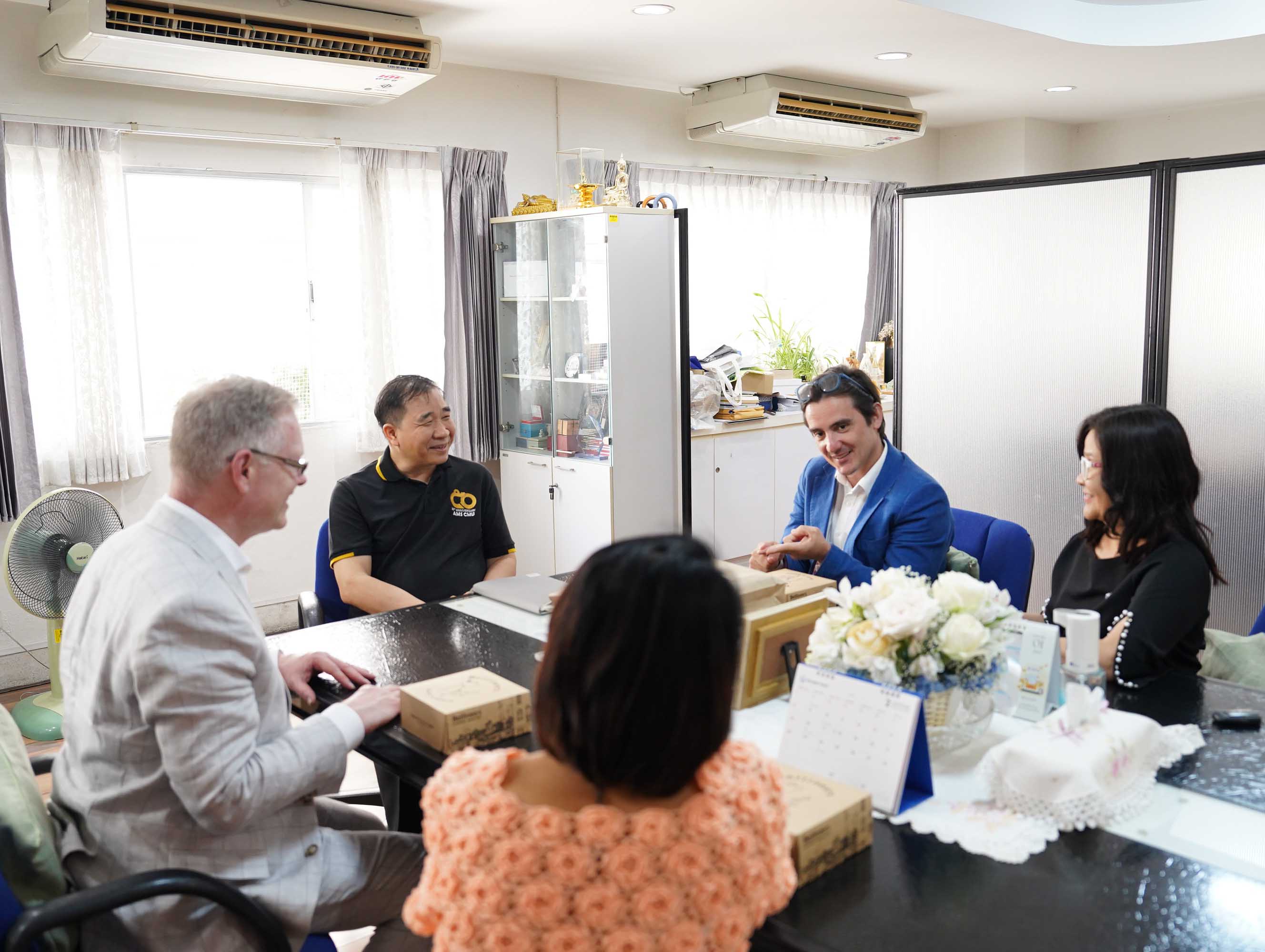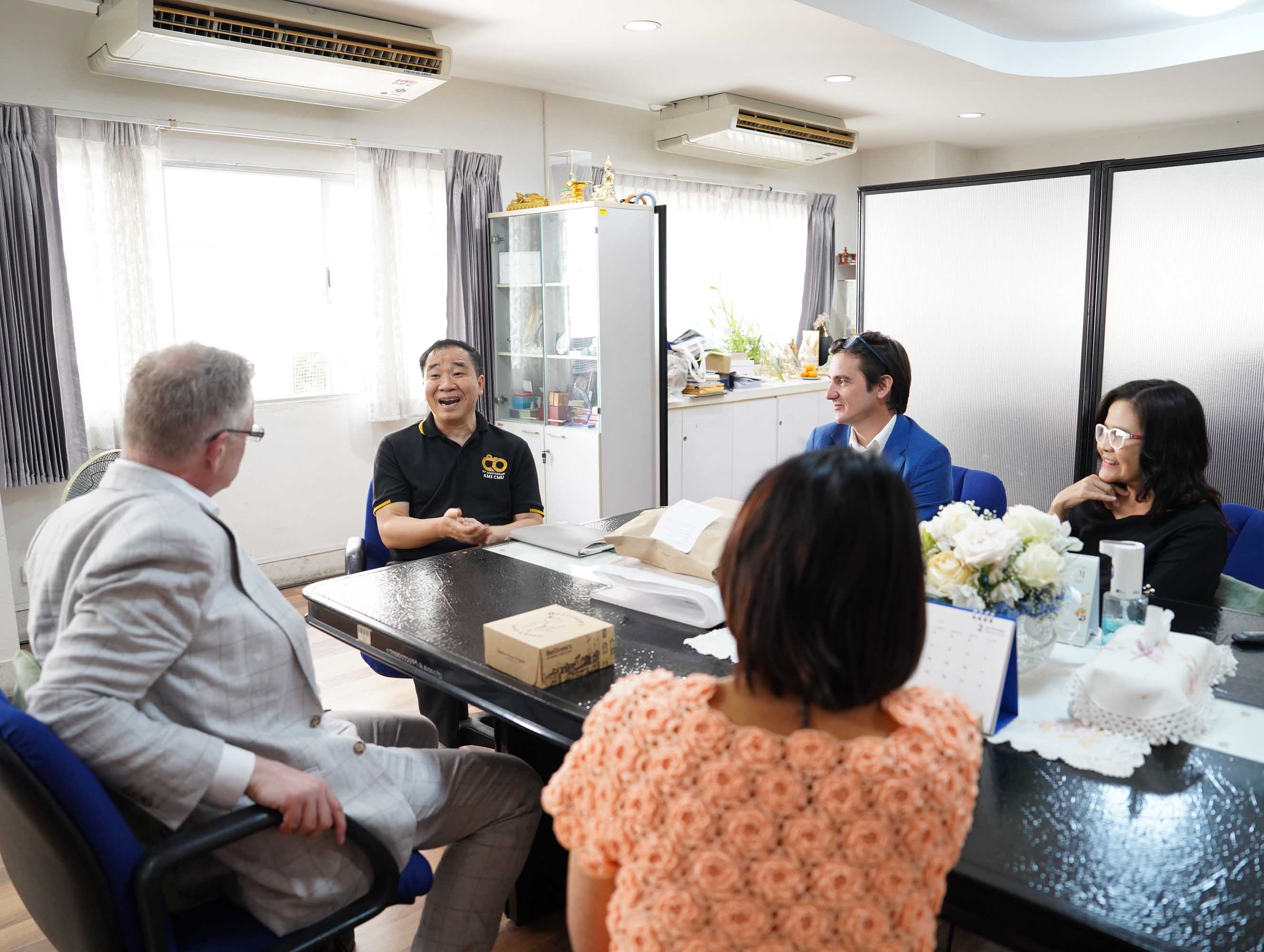 คณะเทคนิคการแพทย์ มหาวิทยาลัยเชียงใหม่ นำโดย ศาสตราจารย์ (เชี่ยวชาญพิเศษ) ดร.สาคร พรประเสริฐ คณบดี พร้อมด้วย รองศาสตราจารย์ ดร.รัชดา เครสซี่ ผู้ช่วยคณบดี ให้การต้อนรับ Dr. Scott T. Rottinghaus, Chief Medical Officer จาก Enanta Pharmaceuticals, Inc., สหรัฐอเมริกา ในโอกาสเยี่ยมเยือน และหารือความร่วมมือด้านการวิจัย โดยมี Dr. Timothy R. Cressey และ คุณประอรสุดา ศุกระกาญจนะ จาก หน่วยวิจัย PHPT (Program for HIV Prevention and Treatment) นำเข้าพบ ณ ห้องคณบดี คณะเทคนิคการแพทย์ มหาวิทยาลัยเชียงใหม่ เมื่อวันจันทร์ที่ 16 กุมภาพันธ์ 2569