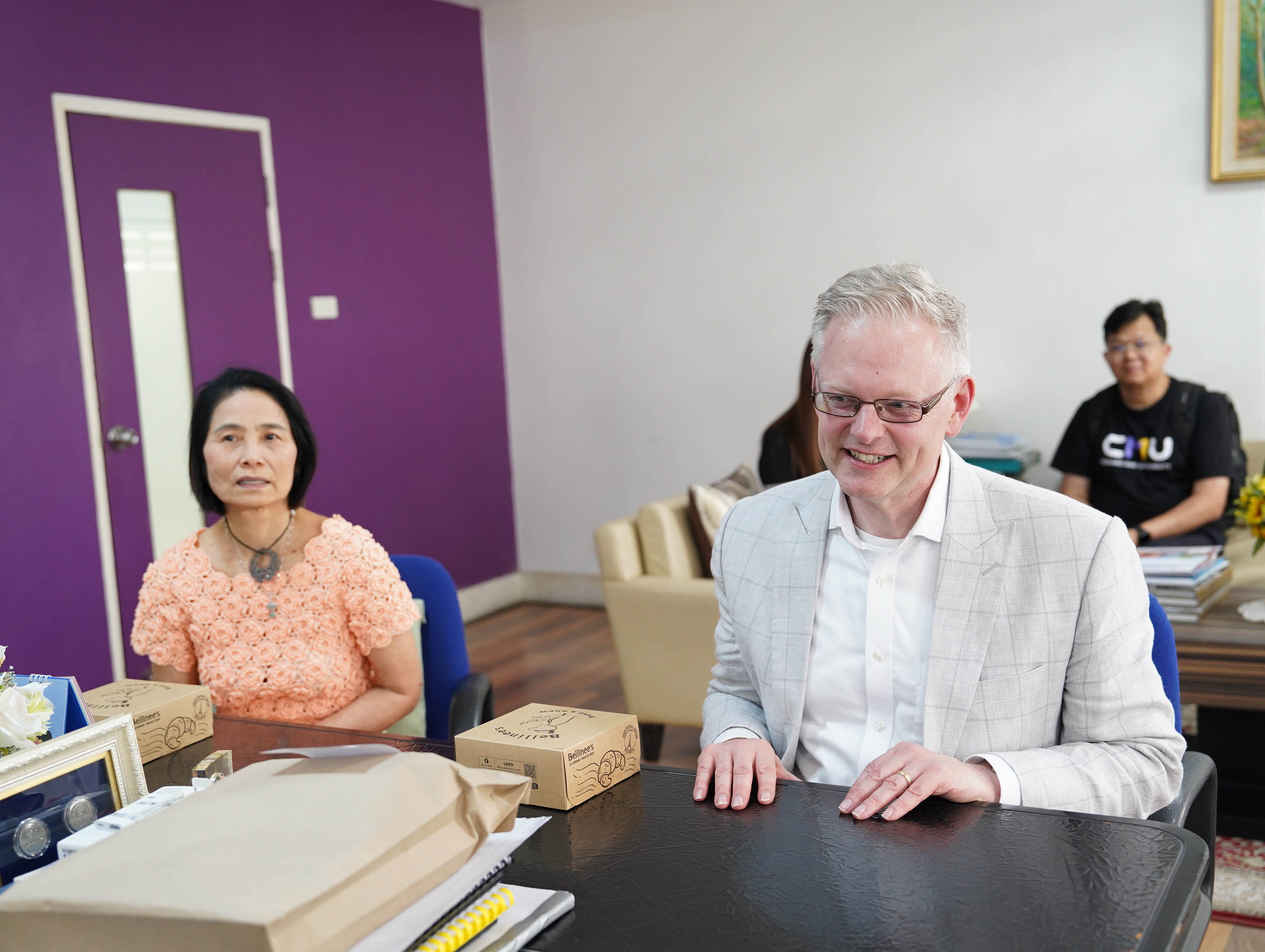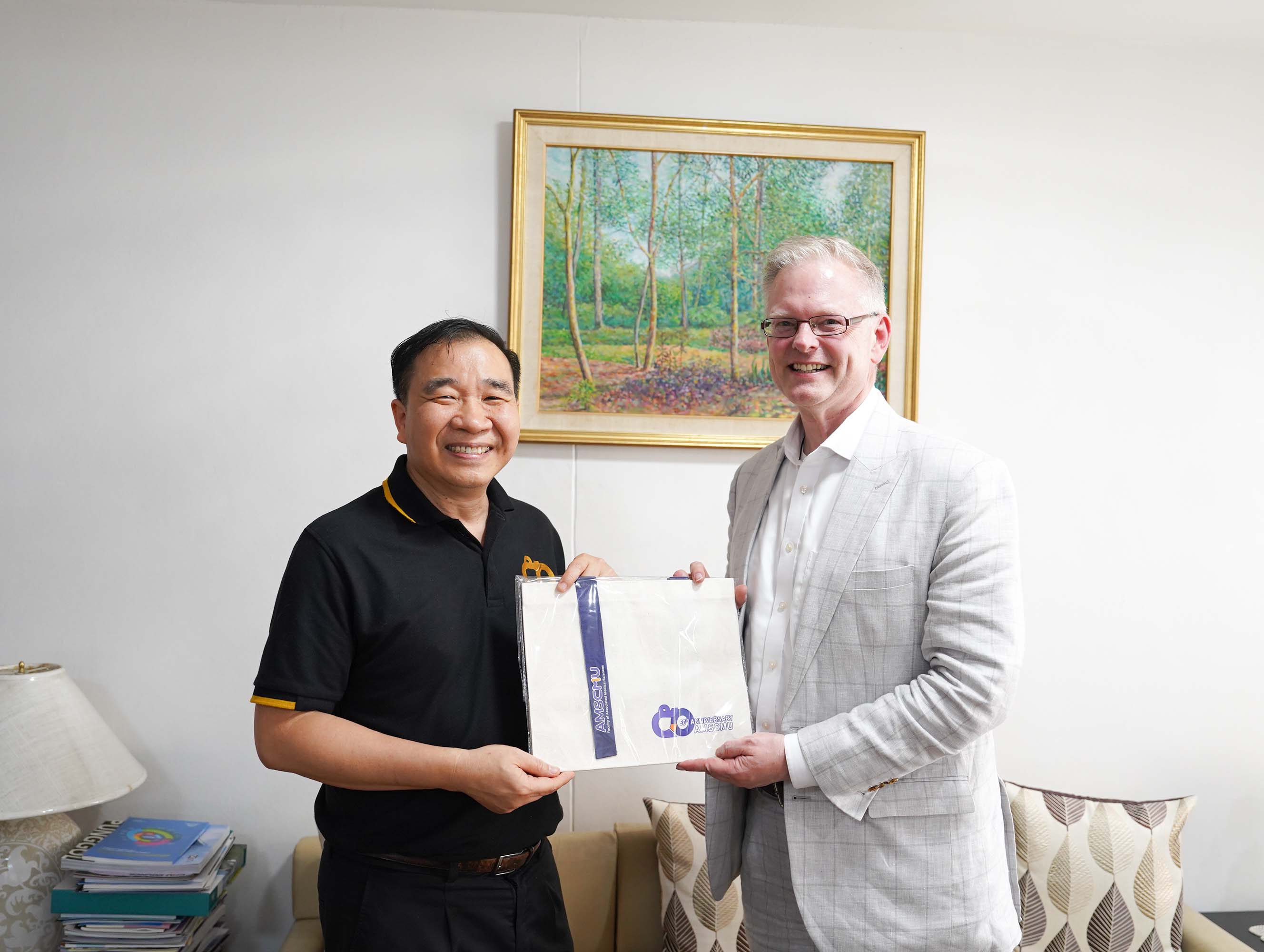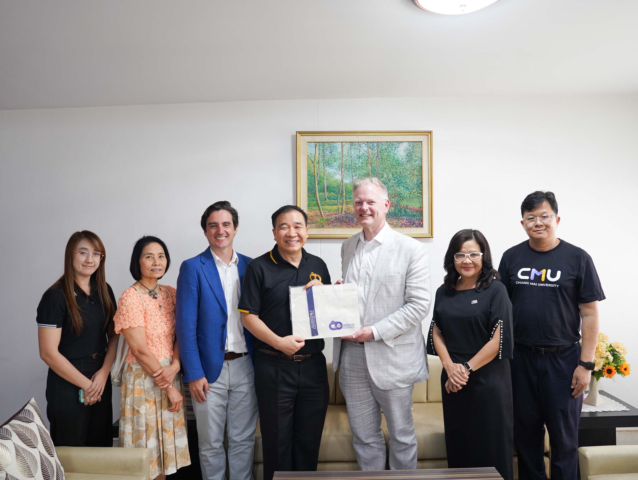 คณะเทคนิคการแพทย์ มหาวิทยาลัยเชียงใหม่ นำโดย ศาสตราจารย์ (เชี่ยวชาญพิเศษ) ดร.สาคร พรประเสริฐ คณบดี พร้อมด้วย รองศาสตราจารย์ ดร.รัชดา เครสซี่ ผู้ช่วยคณบดี ให้การต้อนรับ Dr. Scott T. Rottinghaus, Chief Medical Officer จาก Enanta Pharmaceuticals, Inc., สหรัฐอเมริกา ในโอกาสเยี่ยมเยือน และหารือความร่วมมือด้านการวิจัย โดยมี Dr. Timothy R. Cressey และ คุณประอรสุดา ศุกระกาญจนะ จาก หน่วยวิจัย PHPT (Program for HIV Prevention and Treatment) นำเข้าพบ ณ ห้องคณบดี คณะเทคนิคการแพทย์ มหาวิทยาลัยเชียงใหม่ เมื่อวันจันทร์ที่ 16 กุมภาพันธ์ 2569