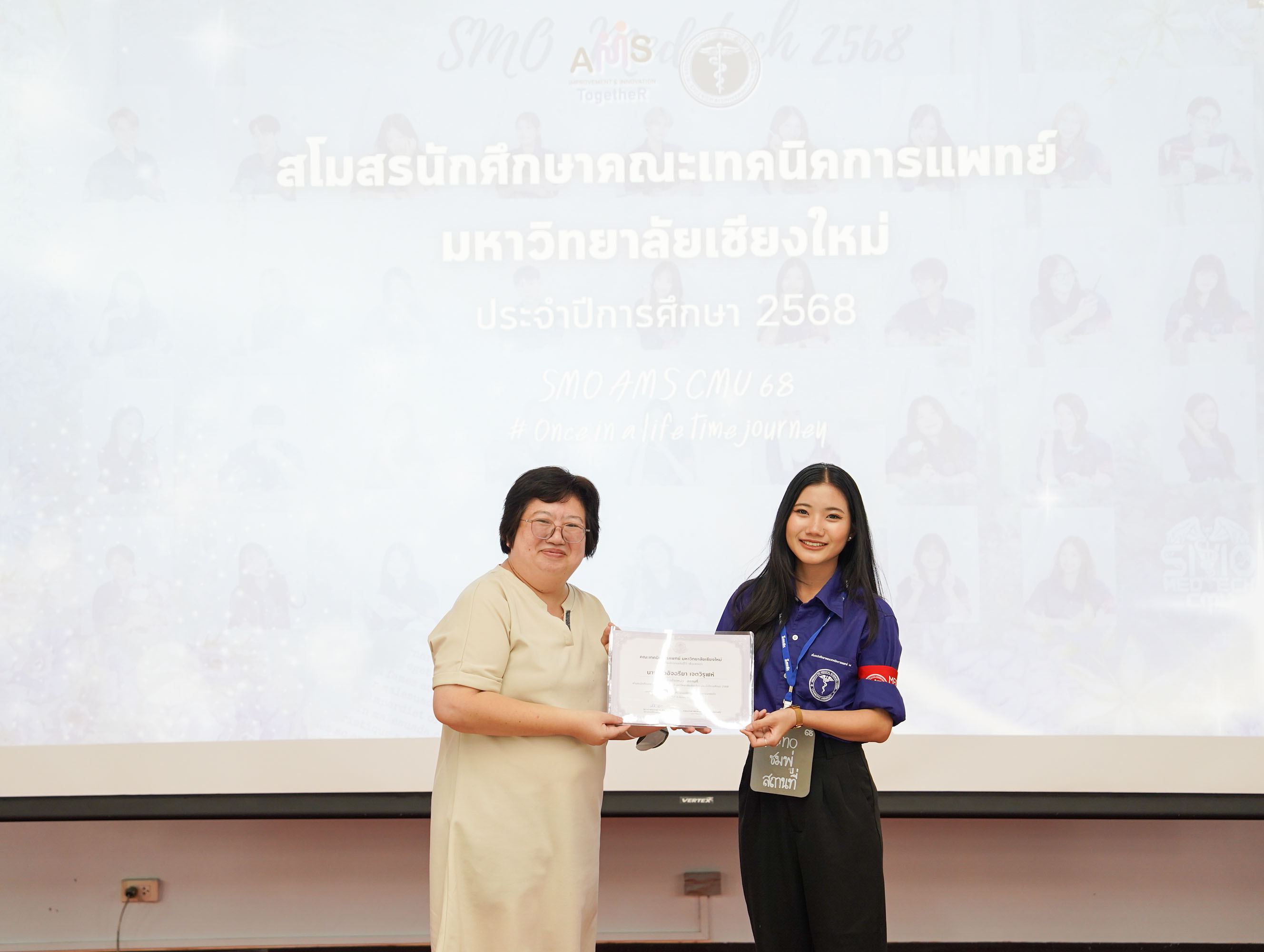 โอกาสนี้หน่วยกิจการนักศึกษาฯ ยังได้จัด พิธีเชิดชูเกียรติผู้นำนักศึกษาในคณะกรรมการสโมสรนักศึกษาประจำปีการศึกษา 2568 เพื่อสร้างขวัญและกำลังใจในการทำงานแก่ผู้นำนักศึกษา ให้เกิดความภาคภูมิใจในภาระหน้าที่ของการเป็นผู้นำนักศึกษา โดยมอบเกียรติบัตรเชิดชูเกียรติ และกล่าวขอบคุณที่ปฏิบัติหน้าที่เป็นผู้นำนักศึกษาจนครบวาระ ณ ห้องประชุมศาสตราจารย์เกียรติคุณ นายแพทย์ชัยโรจน์ แสงอุดม ชั้น 12 คณะเทคนิคการแพทย์ มหาวิทยาลัยเชียงใหม่