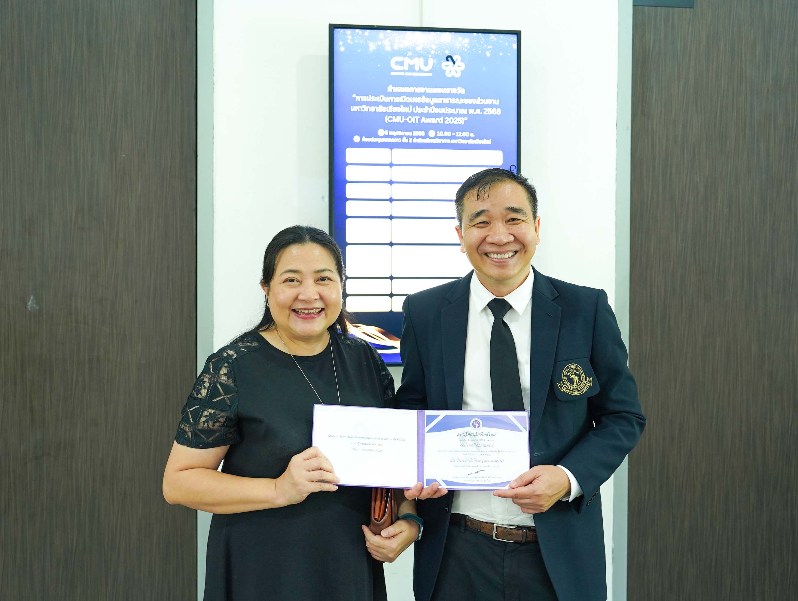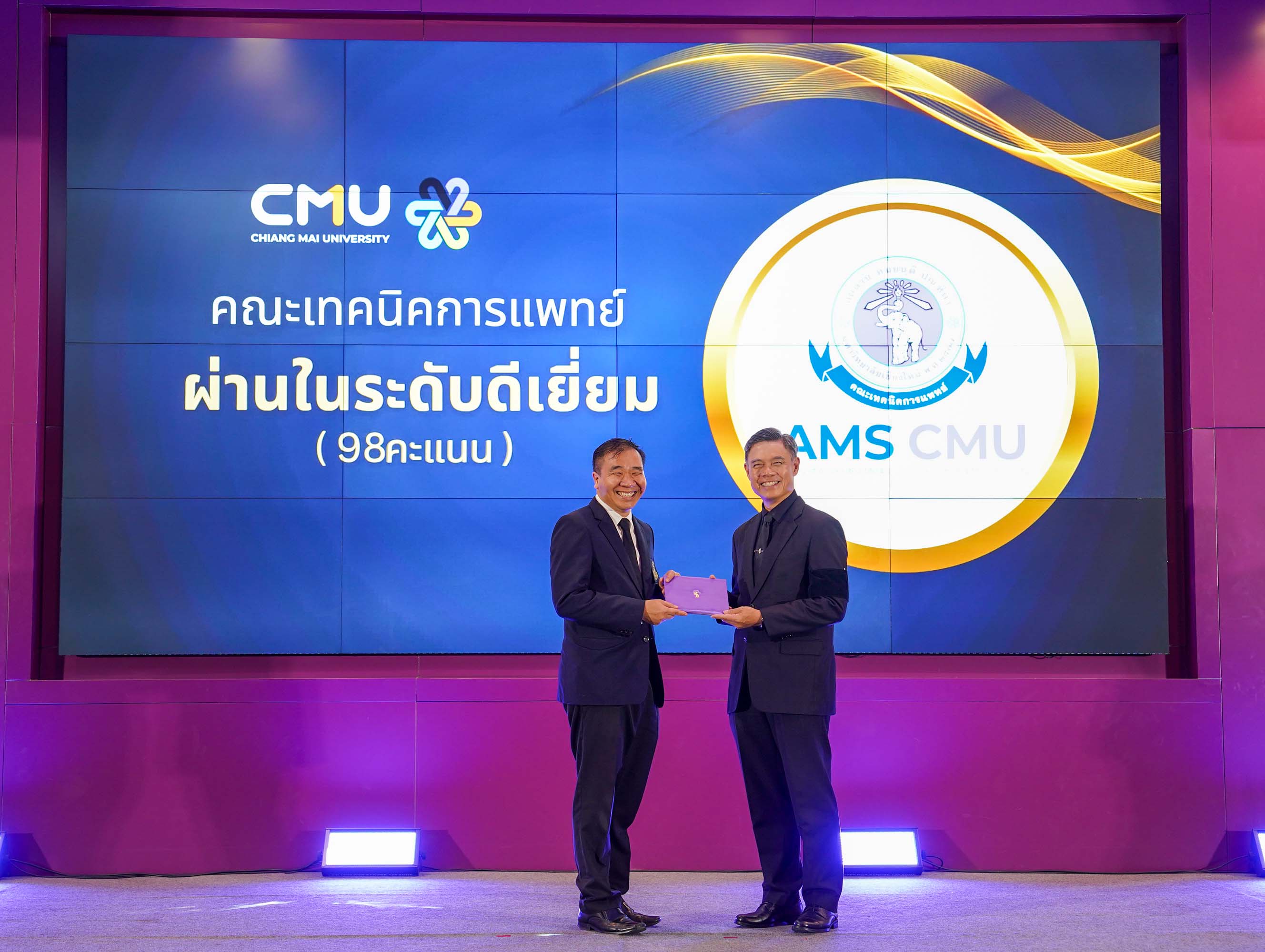 คณะเทคนิคการแพทย์ มหาวิทยาลัยเชียงใหม่ นำโดย ศาสตราจารย์ ดร.สาคร พรประเสริฐ คณบดี พร้อมด้วย รองศาสตราจารย์ ดร.จนัญญา ปัญญามี ทิพย์พยอม รองคณบดี เข้ารับมอบเกียรติบัตรในโอกาสที่คณะฯ ได้รับผลการประเมินคุณธรรมและความโปร่งใสในการดำเนินงานของหน่วยงาน "ผ่านในระดับดีเยี่ยม" (98 คะแนน) ในพิธีมอบรางวัล "การประเมินการเปิดเผยข้อมูลสาธารณะของส่วนงานฯ ประจําปีงบประมาณ 2568 (CMU-OIT Award 2025)" ณ ห้องประชุมทองกวาว ชั้น 2 สํานักบริการวิชาการ มหาวิทยาลัยเชียงใหม่ เมื่อวันพุธที่ 5 พฤศจิกายน 2568