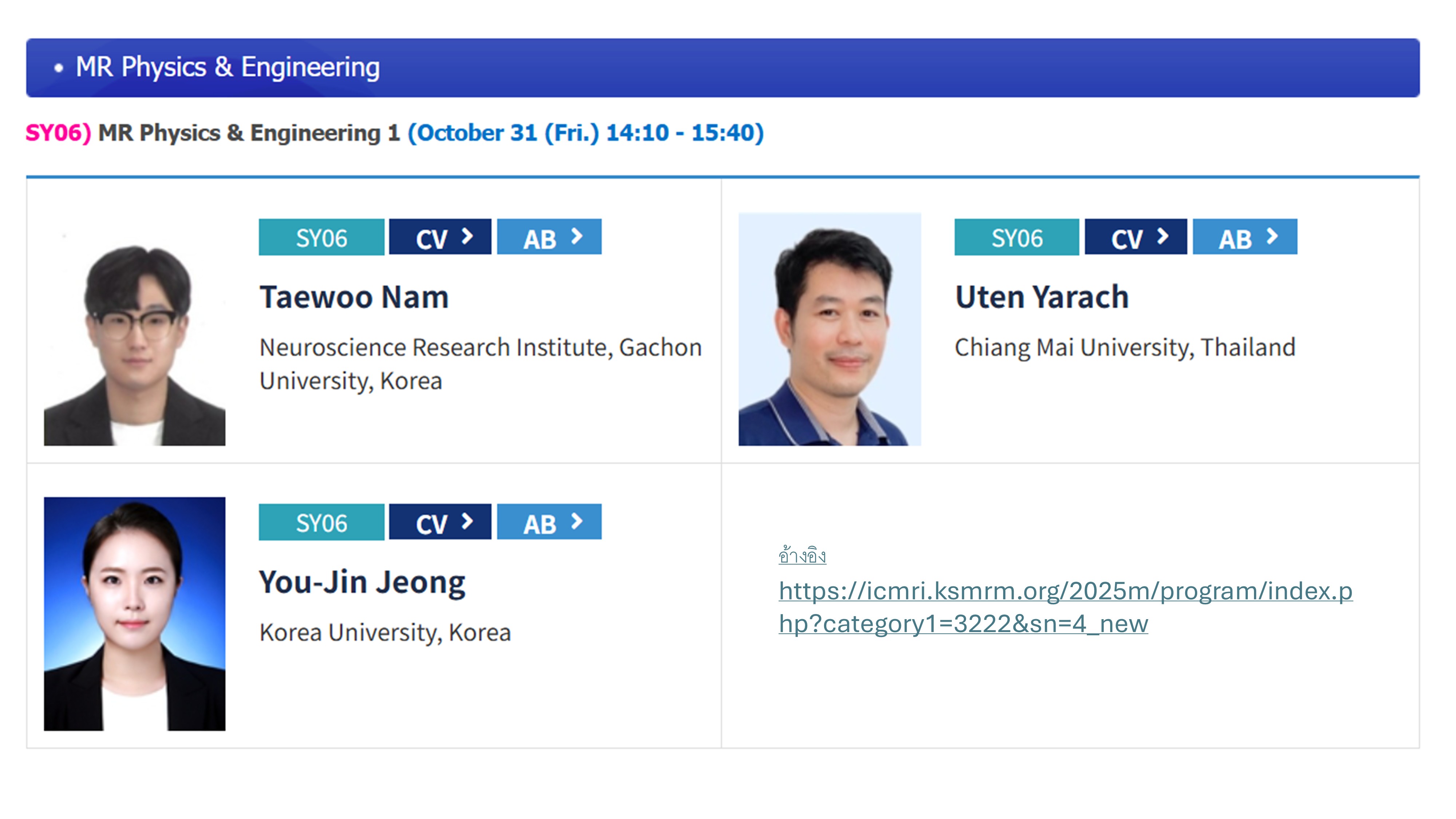ผู้ช่วยศาสตราจารย์ ดร.อุเทน ยะราช อาจารย์ประจำภาควิชารังสีเทคนิค คณะเทคนิคการแพทย์ มหาวิทยาลัยเชียงใหม่ ได้รับเชิญเป็นวิทยากรบรรยายในการประชุมวิชาการ The Korean Society of Magnetic Resonance in Medicine (KSMRM) ณ กรุงโซล สาธารณรัฐเกาหลีใต้ ในหัวข้อ “A Deep Unrolled Neural Network for Multi-Shot MRI Reconstruction” ซึ่งนำเสนอผลงานวิจัยด้านการประมวลผลภาพถ่ายสัญญาณแม่เหล็กไฟฟ้า (MRI) ขั้นสูงโดยใช้เทคโนโลยีปัญญาประดิษฐ์ เมื่อวันศุกร์ที่ 31 ตุลาคม 2568