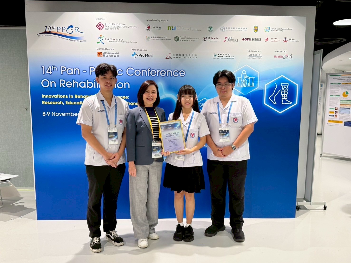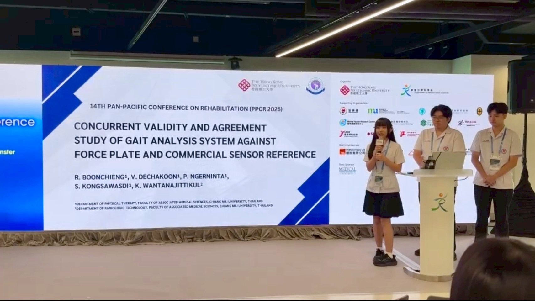 นายพีรณัฐ เงินอินต๊ะ นายวิรัช เดชะคุณ และนางสาวรัฐภรณ์ บุญเชียง นักศึกษาชั้นปีที่ 4 สาขาวิชากายภาพบำบัด คณะเทคนิคการแพทย์ มหาวิทยาลัยเชียงใหม่ ได้รับการคัดเลือกจากคณะกรรมการ the PPCR 2025 Organizing Committee, Hong Kong Polytechnic University ในการนำเสนอ Student Symposium “Learning Through Research: A Symposium Showcasing Undergraduate Innovation in Rehabilitation” โดยนำเสนองานวิจัยภาคนิพนธ์เรื่อง Concurrent Validity and Agreement Study of Gait Analysis System Against Force Plate and Commercial Sensor Reference โดยมี ผู้ช่วยศาสตราจารย์ ดร.ศิริพันธุ์ คงสวัสดิ์ และ ผู้ช่วยศาสตราจารย์ ดร.กิตติชัย วรรธนะจิตติกุล เป็นอาจารย์ที่ปรึกษา ในงานประชุมวิชาการ The 14th Pan-Pacific Conference on Rehabilitation (PPCR 2025) "Innovations in Rehabilitation Sciences: Research, Education and Knowledge Transfer" ณ InnoCentre เกาลูน เขตบริหารพิเศษฮ่องกง ระหว่างวันที่ 8-9 พฤศจิกายน 2568