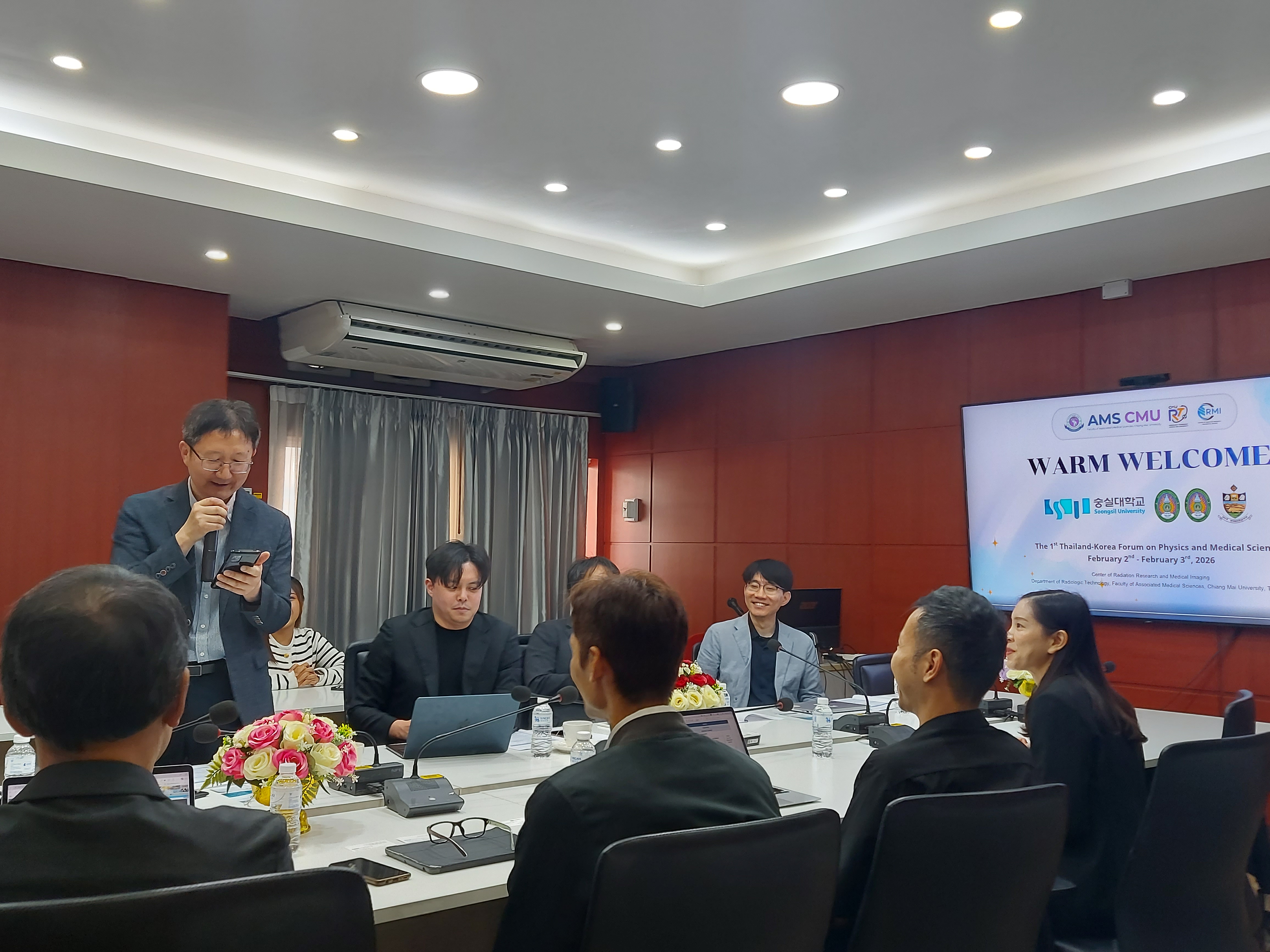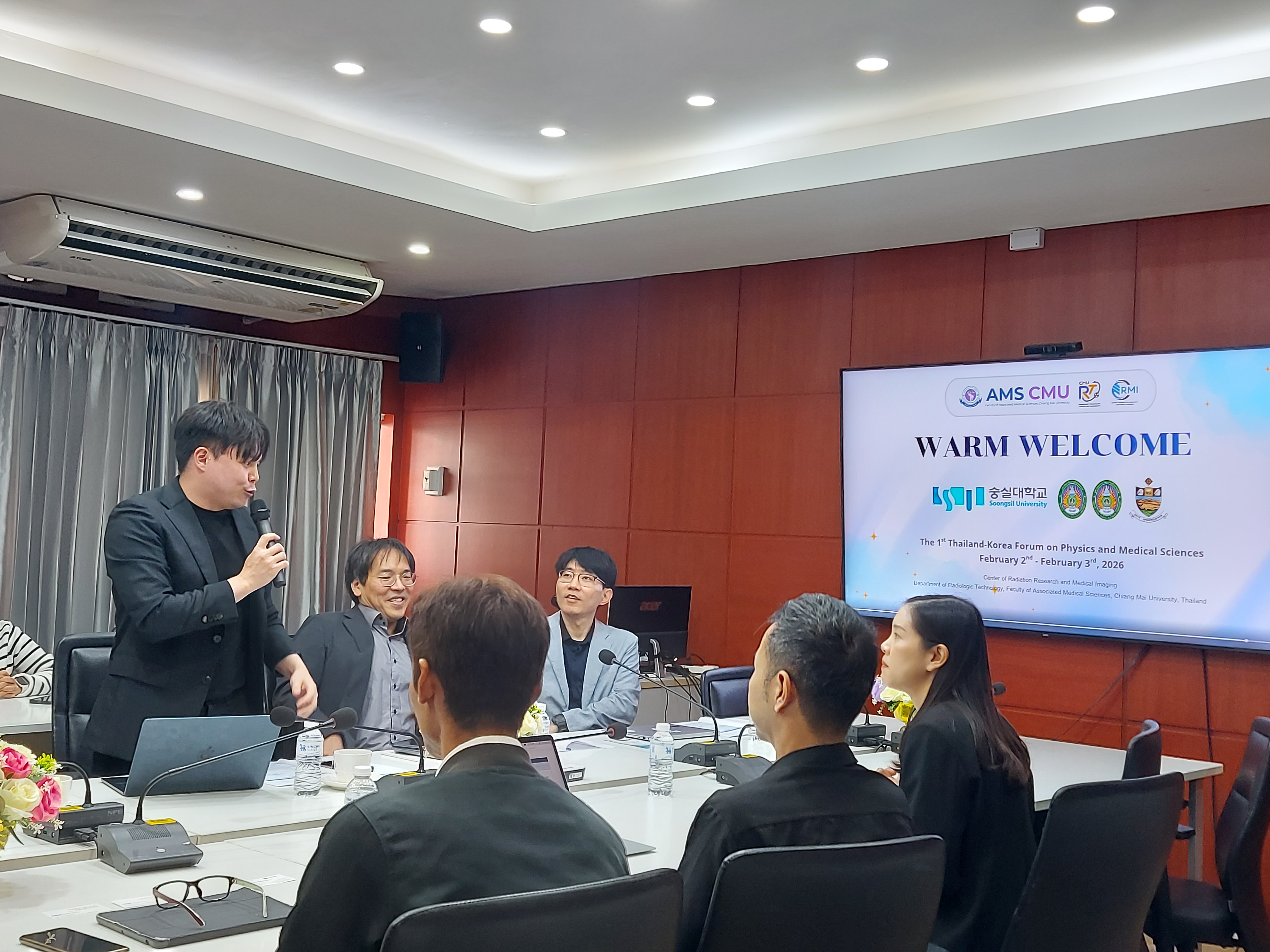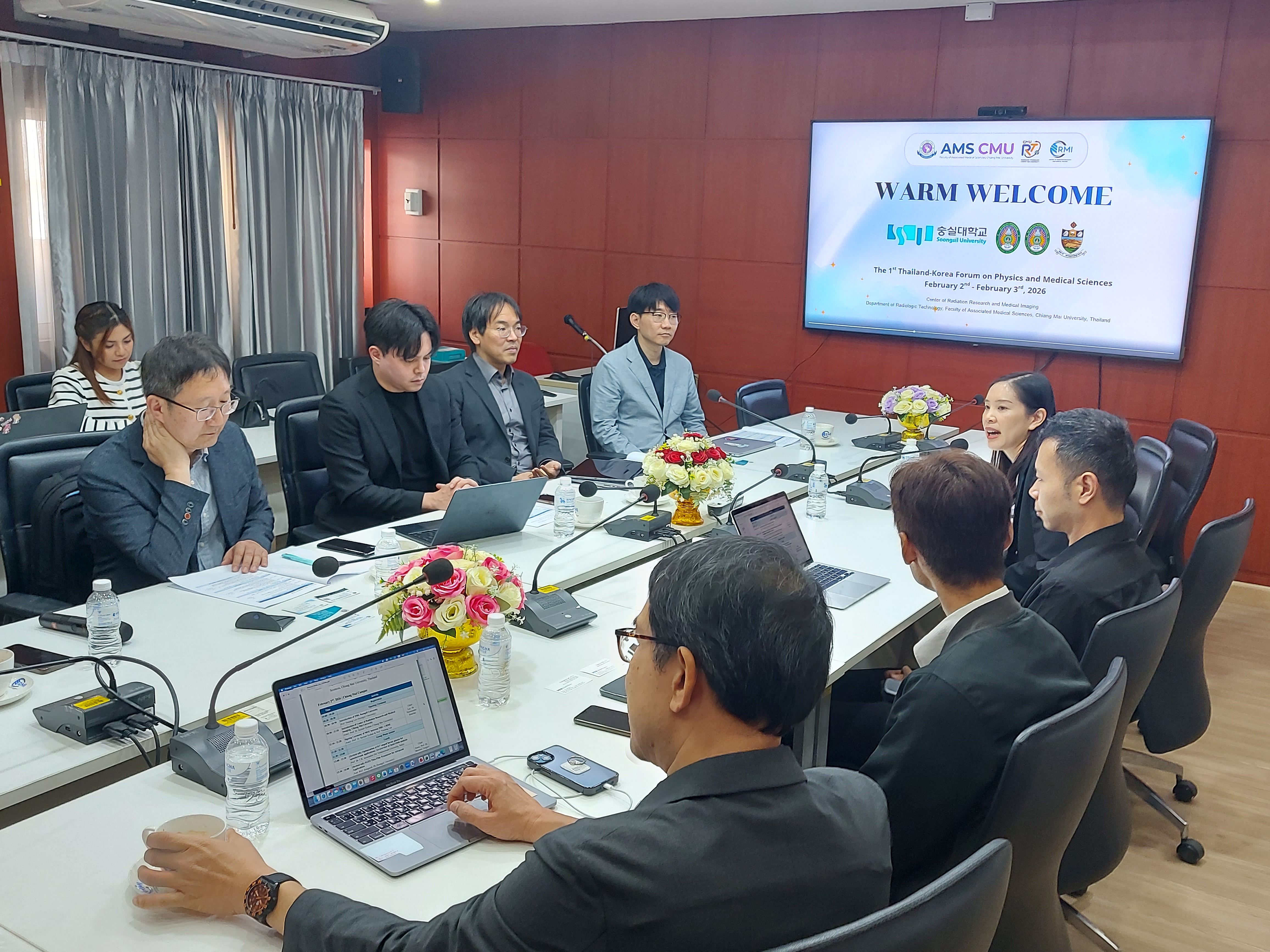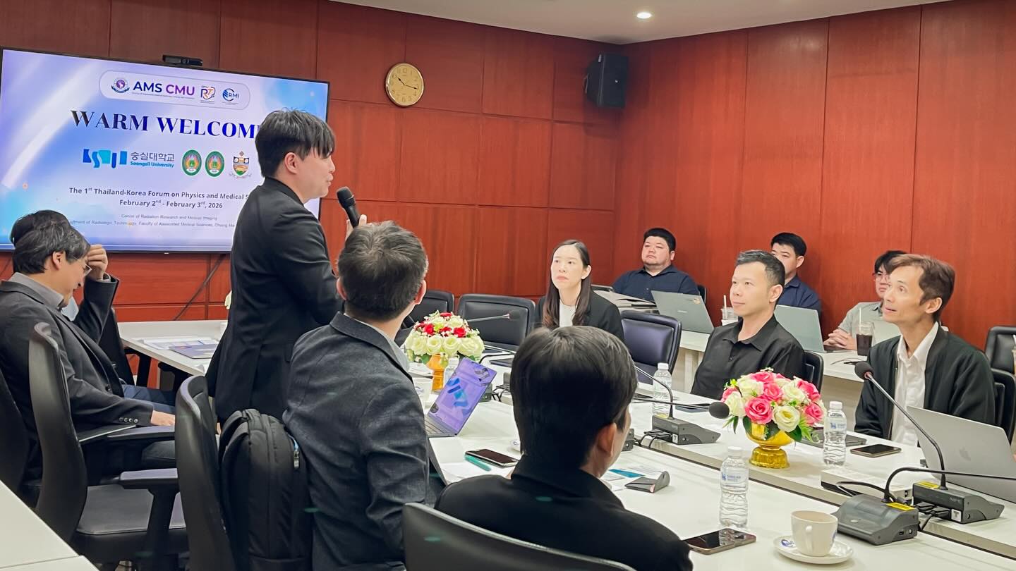 ศาสตราจารย์ (เชี่ยวชาญพิเศษ) ดร.สาคร พรประเสริฐ คณบดี พร้อมด้วย รองศาสตราจารย์ ดร.รัชดา เครสซี่ ผู้ช่วยคณบดี ผู้ช่วยศาสตราจารย์ ดร.ณฐุปกรน์ เดชสุภา หัวหน้าภาควิชารังสีเทคนิค พร้อมด้วยคณาจารย์ ภาควิชารังสีเทคนิค คณะเทคนิคการแพทย์ มหาวิทยาลัยเชียงใหม่ ให้การต้อนรับ Prof. Yunsang Lee Prof. Se Young Park Prof. Hongseok Oh และ Prof. Taekoo Oh จาก Department of Physics, Soongsil University ประเทศเกาหลีใต้ ในโอกาสมาเยือนภาควิชารังสีเทคนิค เพื่อปรึกษาหารือเกี่ยวกับแนวทางการจัดทำบันทึกข้อตกลงความร่วมมือ (MOU) ระหว่างสถาบัน ภายใต้หัวข้อ The 1st Thailand-Korean Forum on Physics and Medical Sciences ณ ห้องประชุมภาควิชารังสีเทคนิค ชั้น 2 อาคาร 2 คณะเทคนิคการแพทย์ มหาวิทยาลัยเชียงใหม่ เมื่อวันจันทร์ที่ 2 กุมภาพันธ์ 2569
