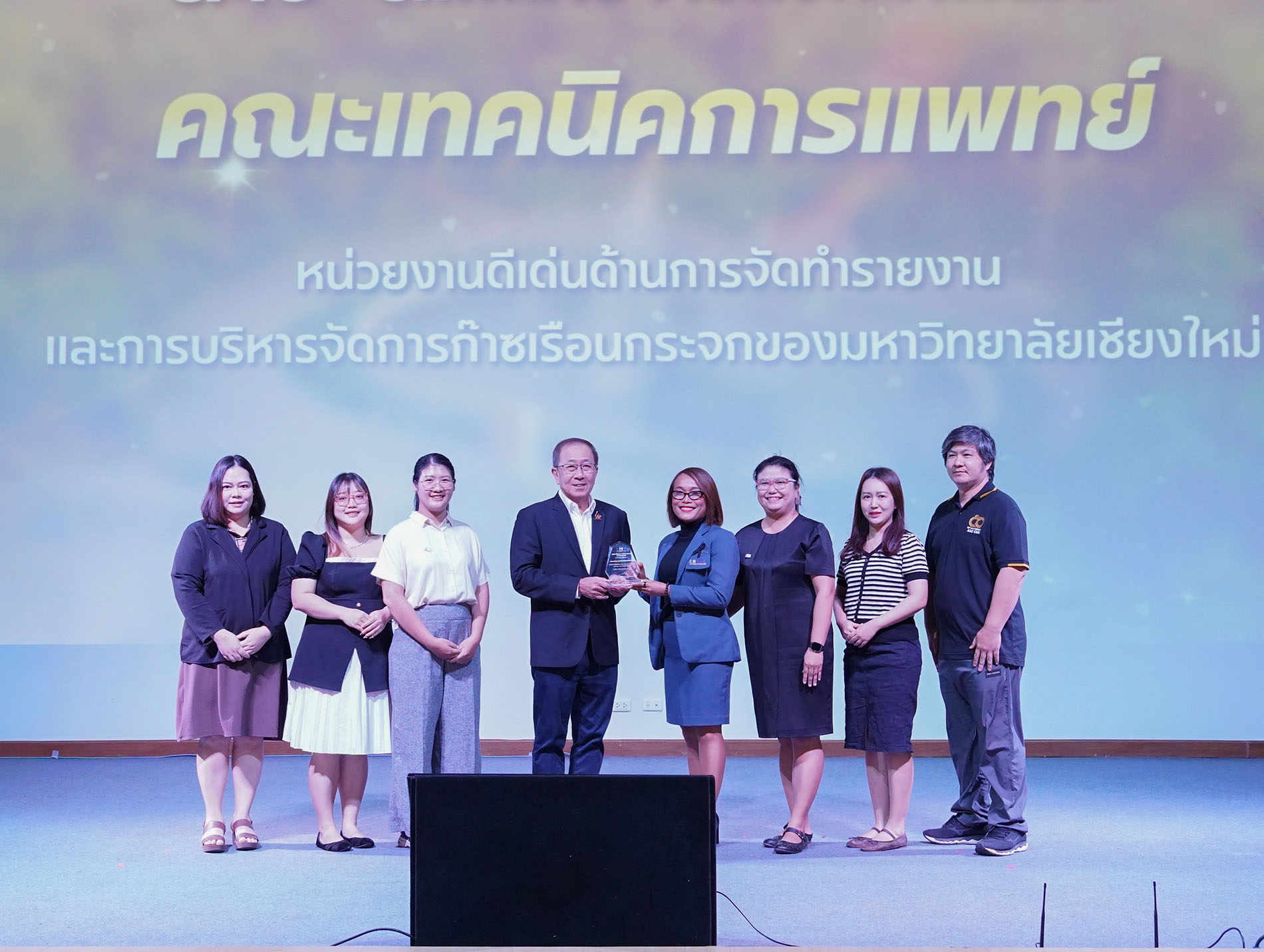 คณะเทคนิคการแพทย์ มหาวิทยาลัยเชียงใหม่ นำโดย ผู้ช่วยศาสตราจารย์ ดร.สุรัชณีย์ พัดงาม ผู้ช่วยคณบดี คุณวาสนา พิโลนพงศธร เลขานุการคณะฯ พร้อมด้วยบุคลากร เข้ารับมอบโล่รางวัล CMU Climate Action Award หน่วยงานดีเด่นด้านการจัดทํารายงานและการบริหารจัดการก๊าซเรือนกระจกของมหาวิทยาลัยเชียงใหม่ จาก รองศาสตราจารย์ ประเสริฐ ฤกษ์เกรียงไกร รองอธิการบดีมหาวิทยาลัยเชียงใหม่ ในงาน CMU CARBON ONE FORUM ณ NSP Rice Grain Auditorium จังหวัดเชียงใหม่ เมื่อวันศุกร์ที่ 13 กุมภาพันธ์ 2569