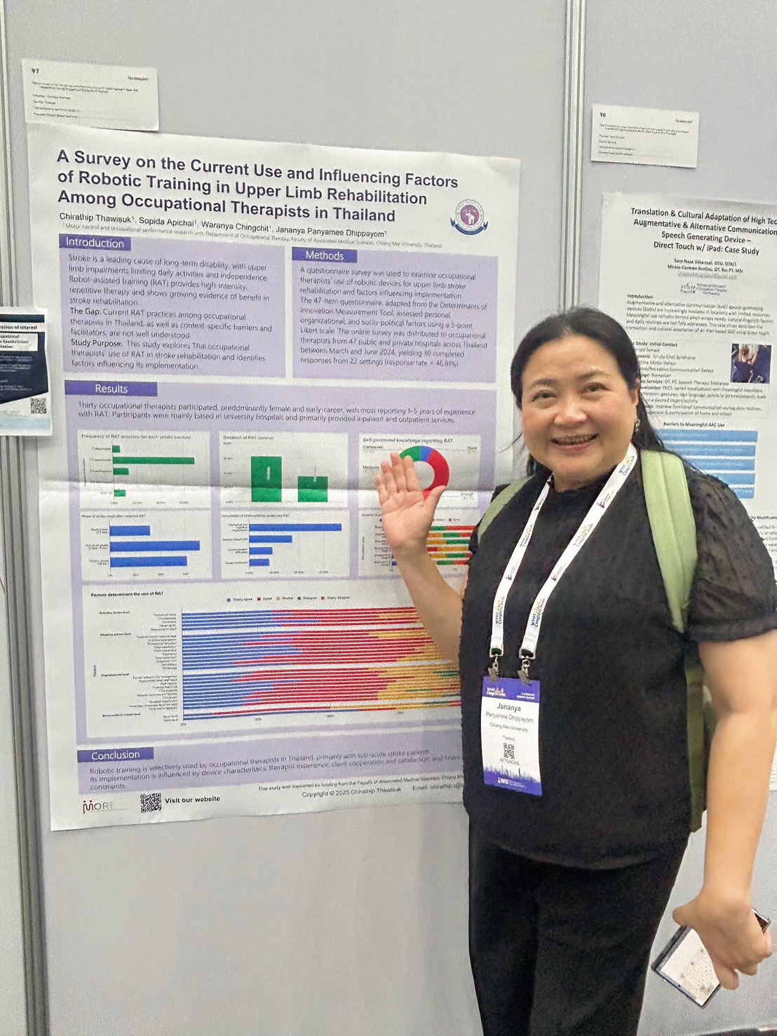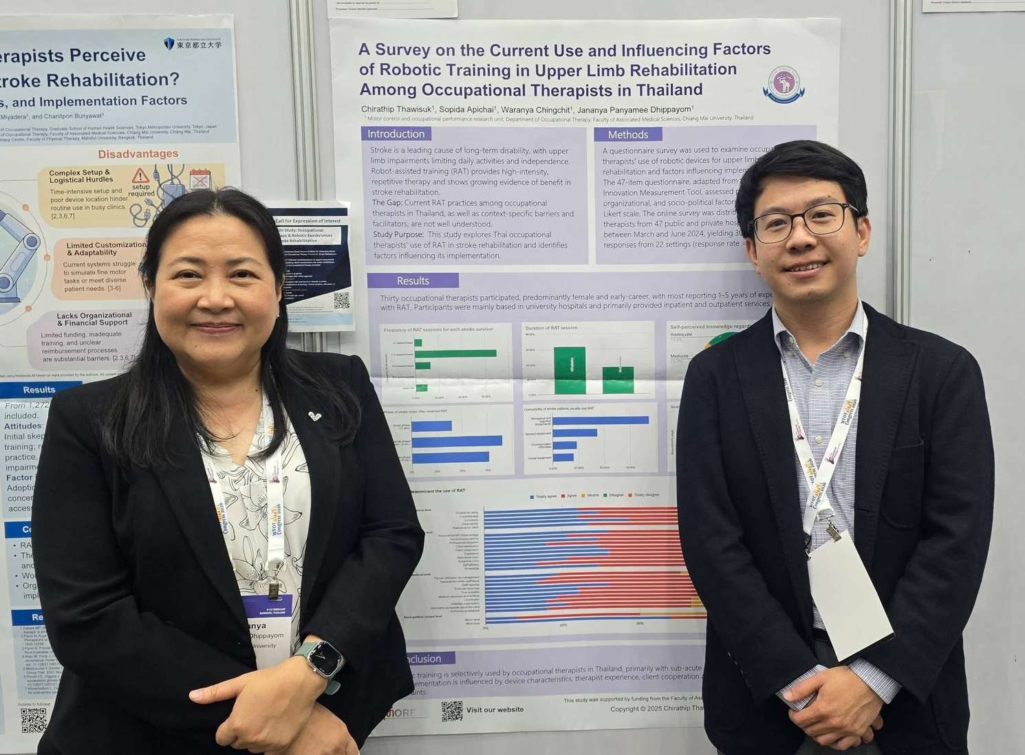 - “A survey on the current use and influencing factors of robotic training in upper limb rehabilitation among occupational therapists in Thailand” Presented by: Lecturer Chirathip Thawisuk, Asst. Prof. Dr. Sopida Apichai, Dr. Waranya Chingchit, and Assoc. Prof. Dr. Jananya Panyamee Dhippayom. (This work was selected as one of the top 100 posters for the Showcase session)