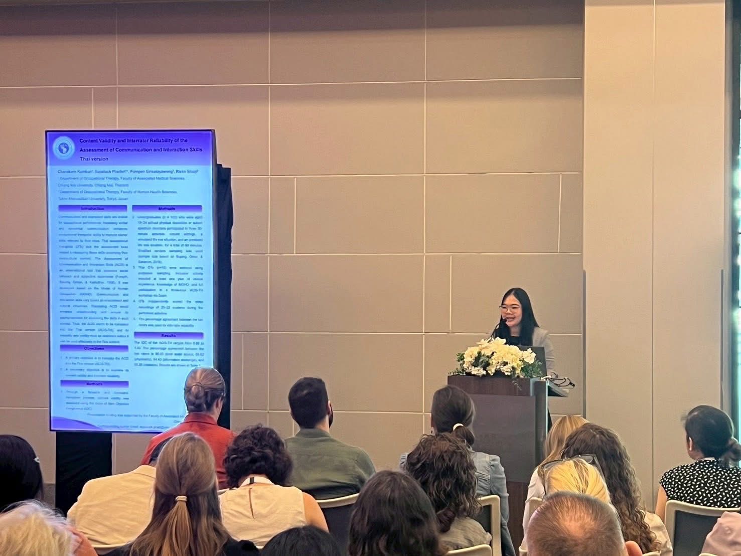 - “Content Validity and Interrater Reliability of the Assessment of Communication and Interaction Skills Thai Version” (Lightning Talk) Presented by: Ms. Chanakarn Kumkun (Ph.D. student in Occupational Therapy). Advisors: Dr. Supaluck Phadsri, Asst. Prof. Dr. Pornpen Sirisatayawong, and Prof. Dr. Rieko Shioji, M.D.