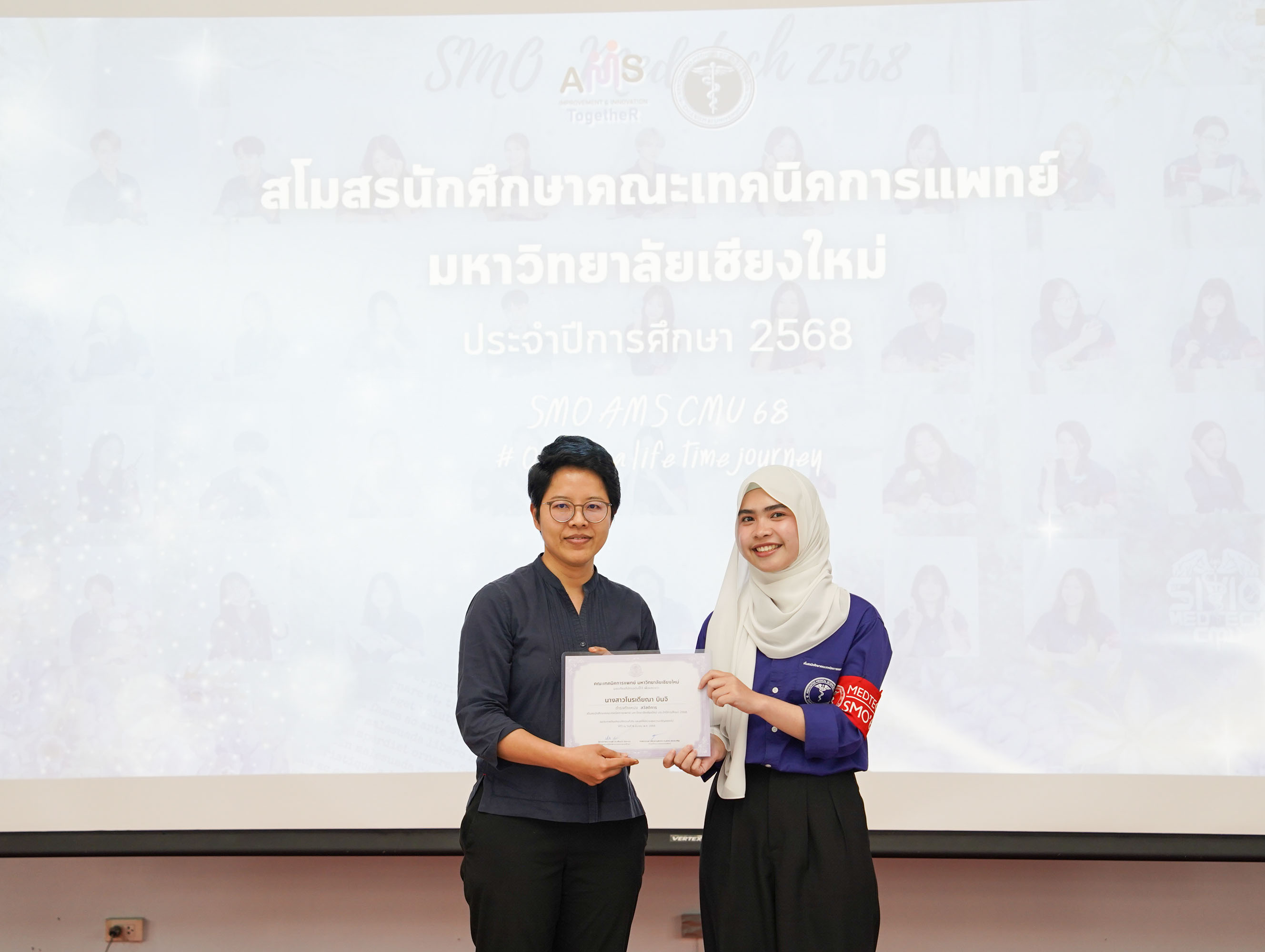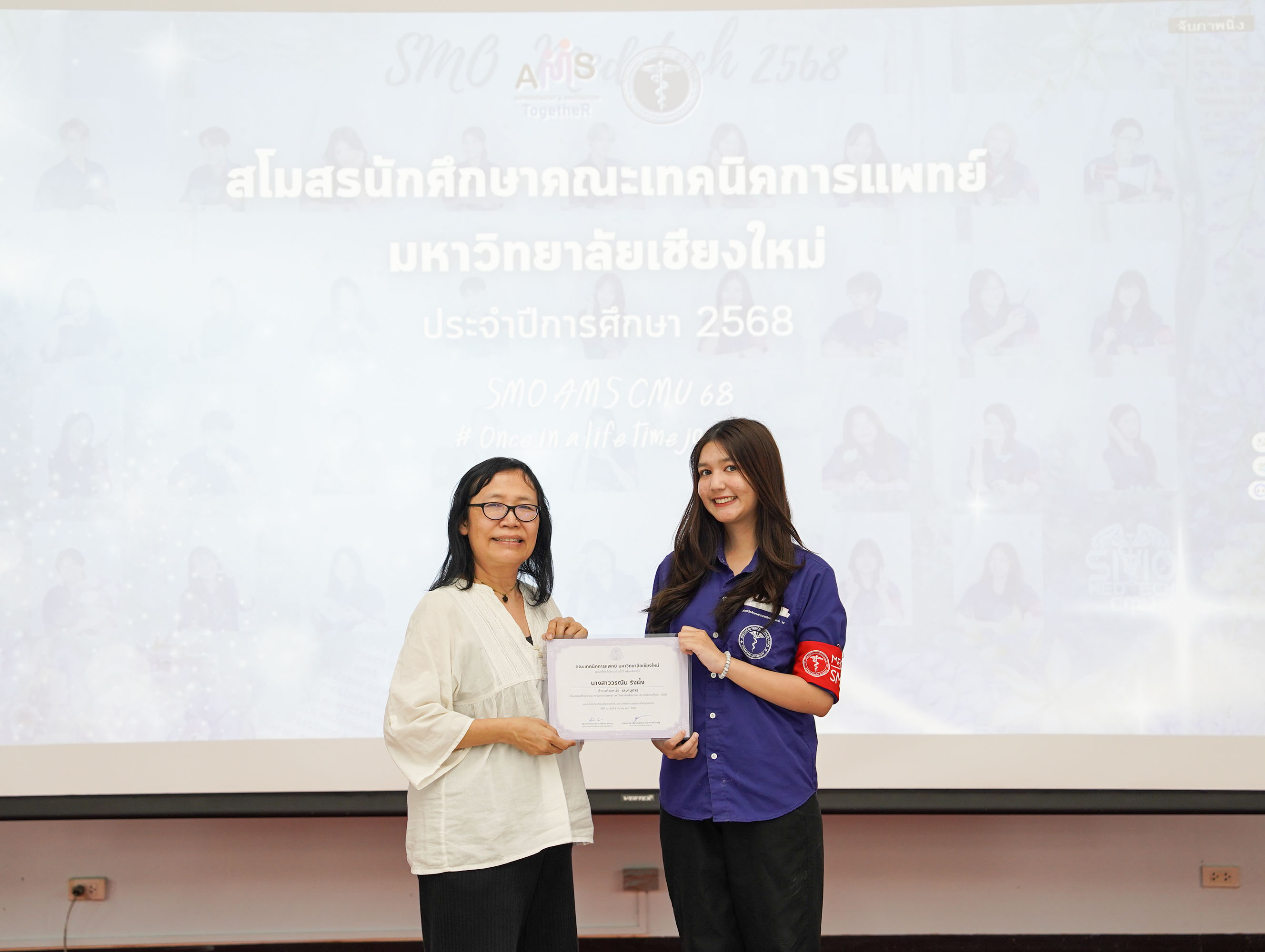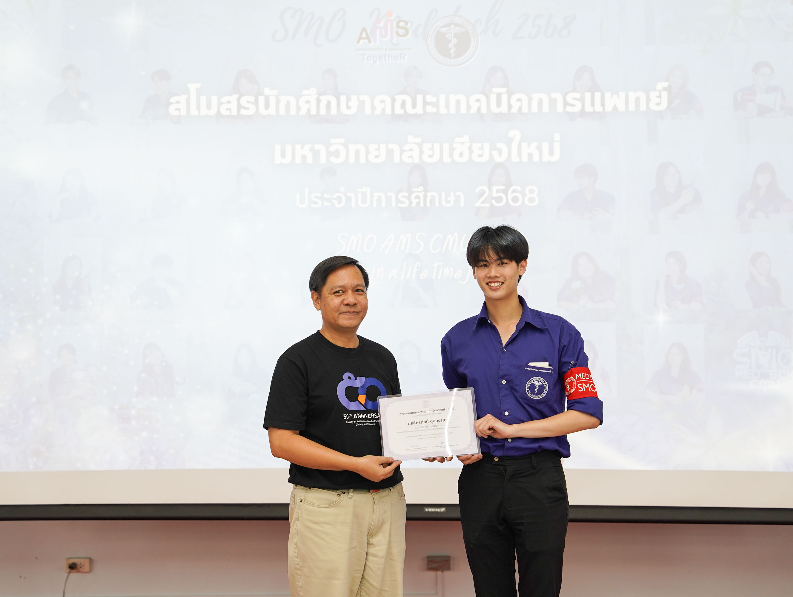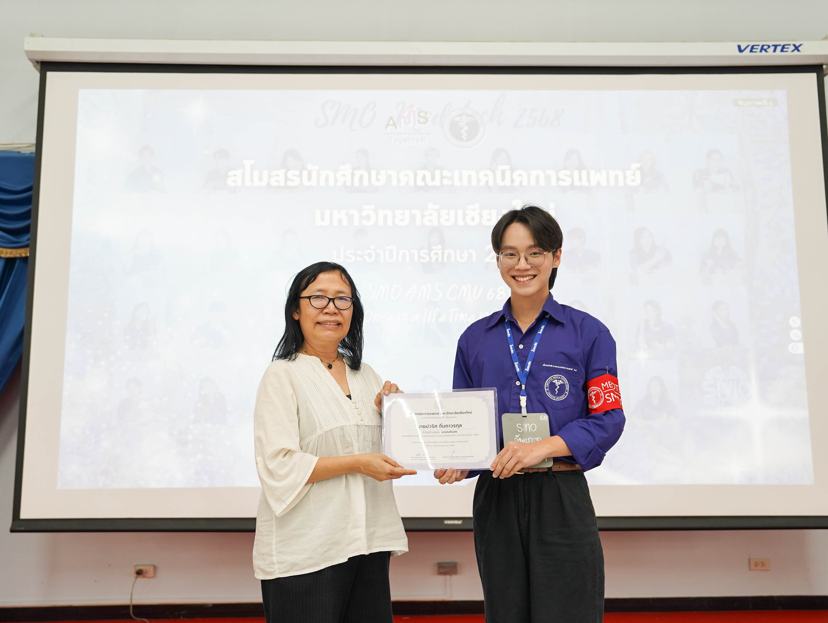 โอกาสนี้หน่วยกิจการนักศึกษาฯ ยังได้จัด พิธีเชิดชูเกียรติผู้นำนักศึกษาในคณะกรรมการสโมสรนักศึกษาประจำปีการศึกษา 2568 เพื่อสร้างขวัญและกำลังใจในการทำงานแก่ผู้นำนักศึกษา ให้เกิดความภาคภูมิใจในภาระหน้าที่ของการเป็นผู้นำนักศึกษา โดยมอบเกียรติบัตรเชิดชูเกียรติ และกล่าวขอบคุณที่ปฏิบัติหน้าที่เป็นผู้นำนักศึกษาจนครบวาระ ณ ห้องประชุมศาสตราจารย์เกียรติคุณ นายแพทย์ชัยโรจน์ แสงอุดม ชั้น 12 คณะเทคนิคการแพทย์ มหาวิทยาลัยเชียงใหม่