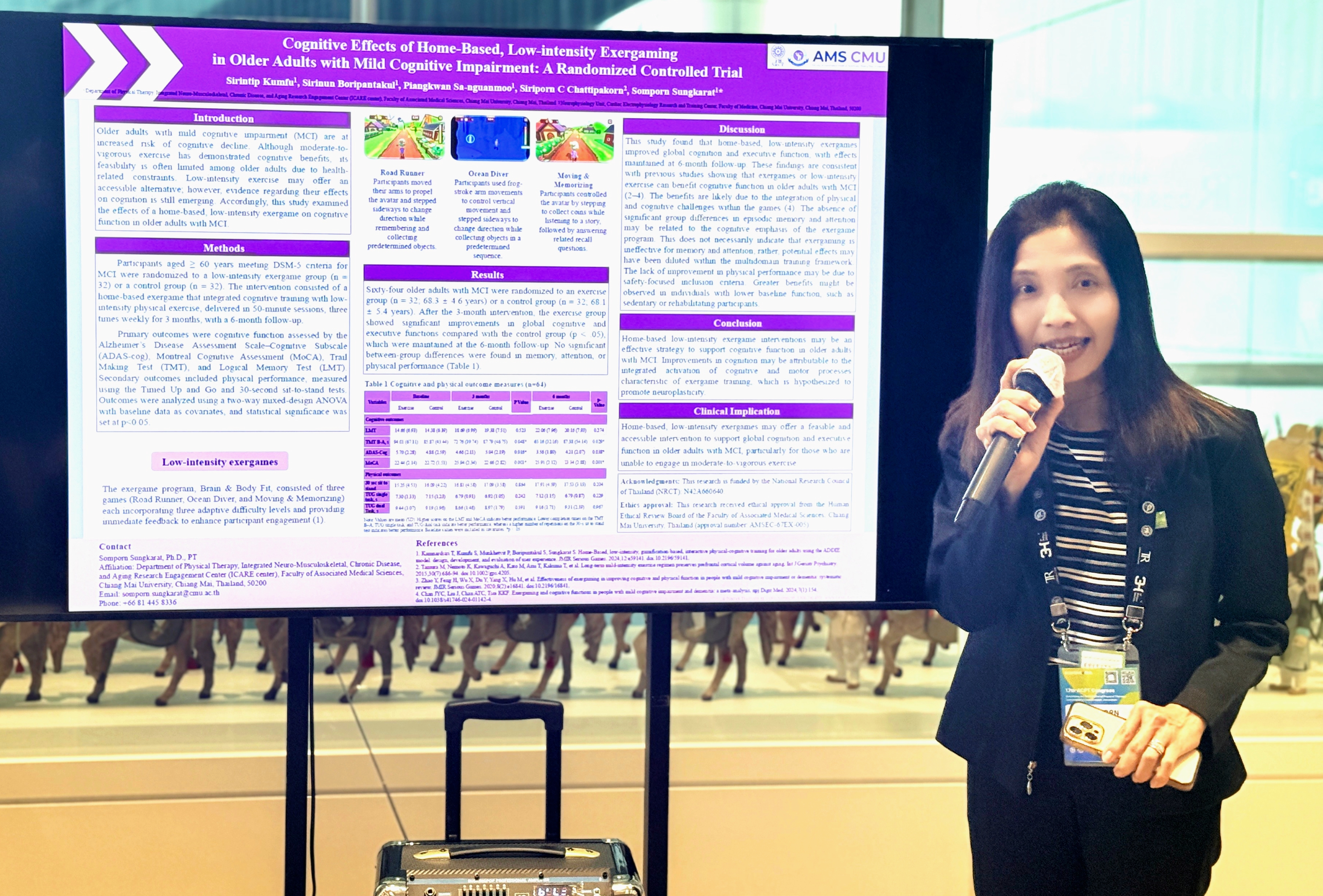 รองศาสตราจารย์ ดร.สมพร สังขรัตน์ อาจารย์ประจำภาควิชากายภาพบำบัด คณะเทคนิคการแพทย์ มหาวิทยาลัยเชียงใหม่ ได้รับรางวัล "The Best Presentation Award" จากการนำเสนอผลงานวิจัย เรื่อง "Cognitive Effects of Home-Based, Low-intensity Exergaming in Older Adults with Mild Cognitive Impairment: A Randomized Controlled Trial" ในงานประชุมวิชาการกายภาพบำบัดระดับนานาชาติของภูมิภาคเอเชีย "The 17th Asian Confederation for Physical Therapy (ACPT) Congress 2026" ณ Suwon Convention Center ประเทศเกาหลีใต้ เมื่อวันที่ 11 - 12 เมษายน 2569