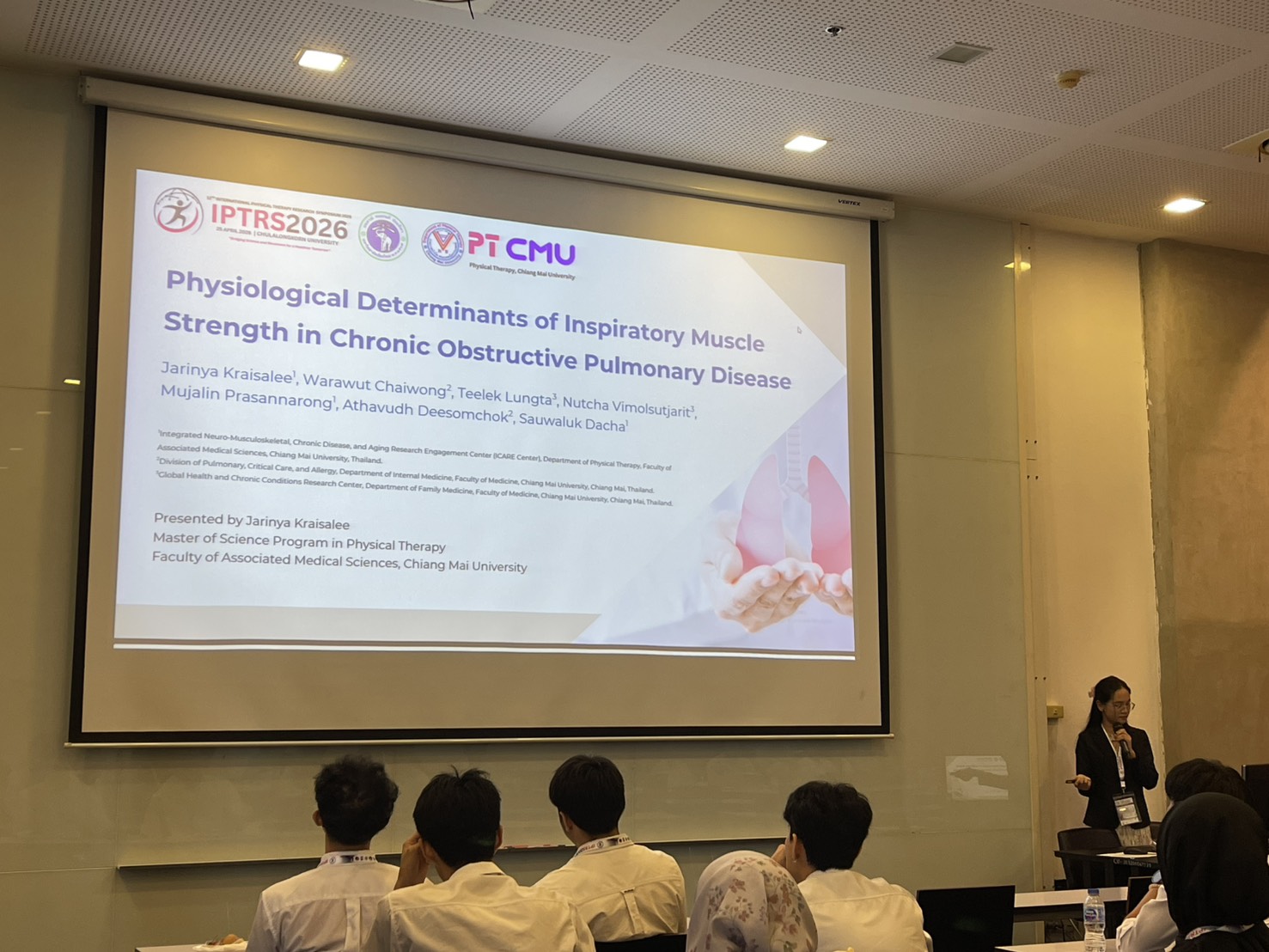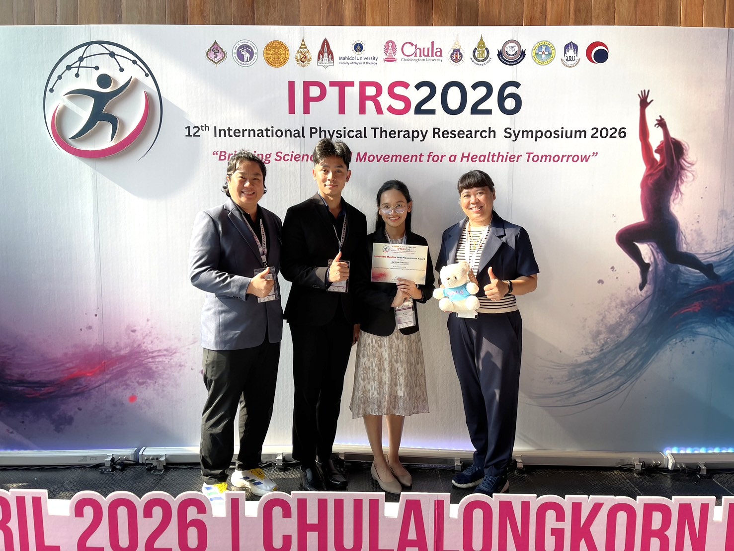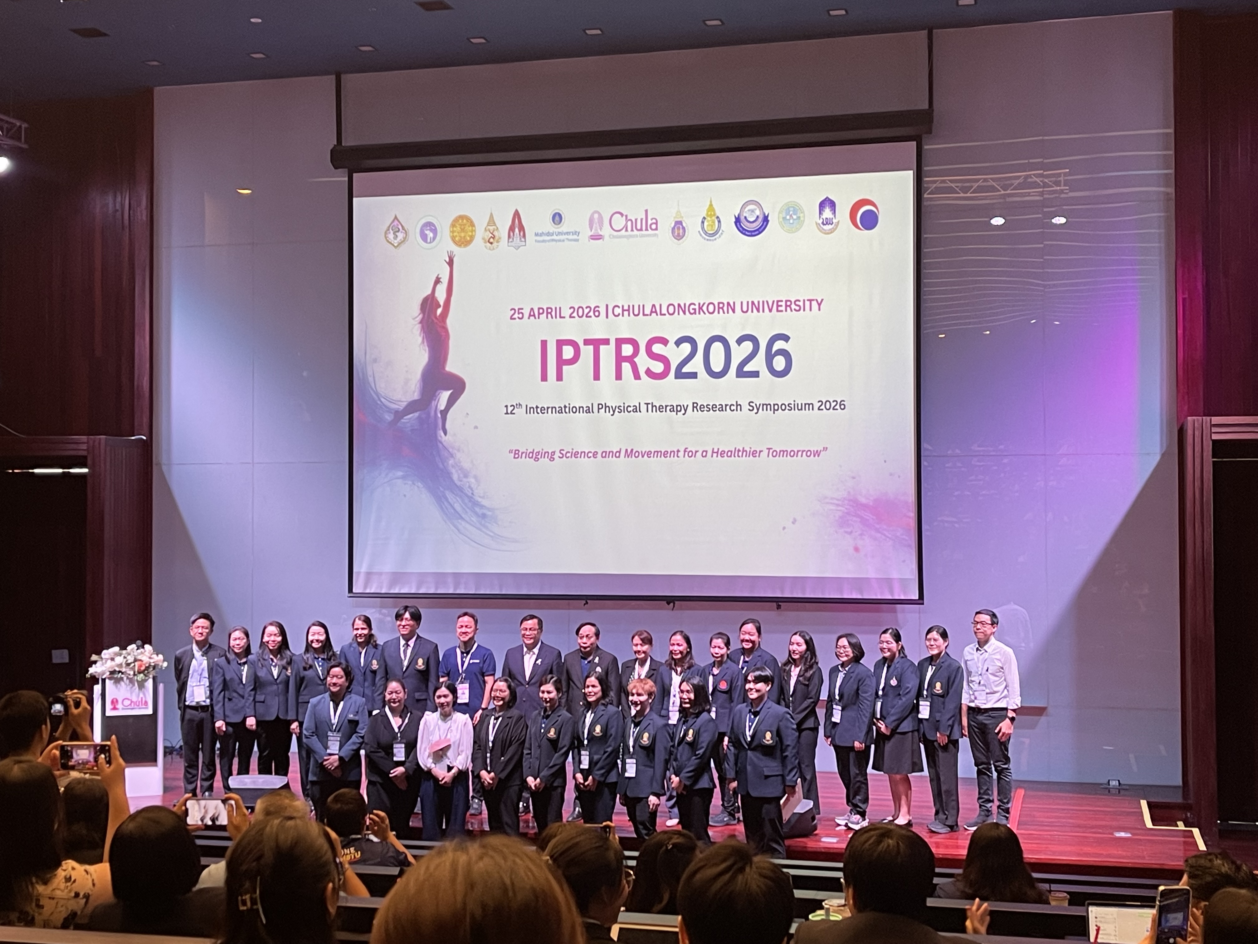 คณาจารย์ภาควิชากายภาพบำบัด คณะเทคนิคการแพทย์ มหาวิทยาลัยเชียงใหม่ นำโดย ผู้ช่วยศาสตราจารย์ ดร.บุษบา ฉั่วตระกูล และ ผู้ช่วยศาสตราจารย์ ดร.เสาวลักษณ์ เดชะ ได้นำทีมนักศึกษาระดับบัณฑิตศึกษาเข้าร่วมงานประชุม INTERNATIONAL PHYSICAL THERAPY RESEARCH SYMPOSIUM 2026 (IPTRS 2026) ในหัวข้อ “Bridging Science and Movement for a Healthier Tomorrow” ณ จุฬาลงกรณ์มหาวิทยาลัย เมื่อวันเสาร์ที่ 25 เมษายน 2569