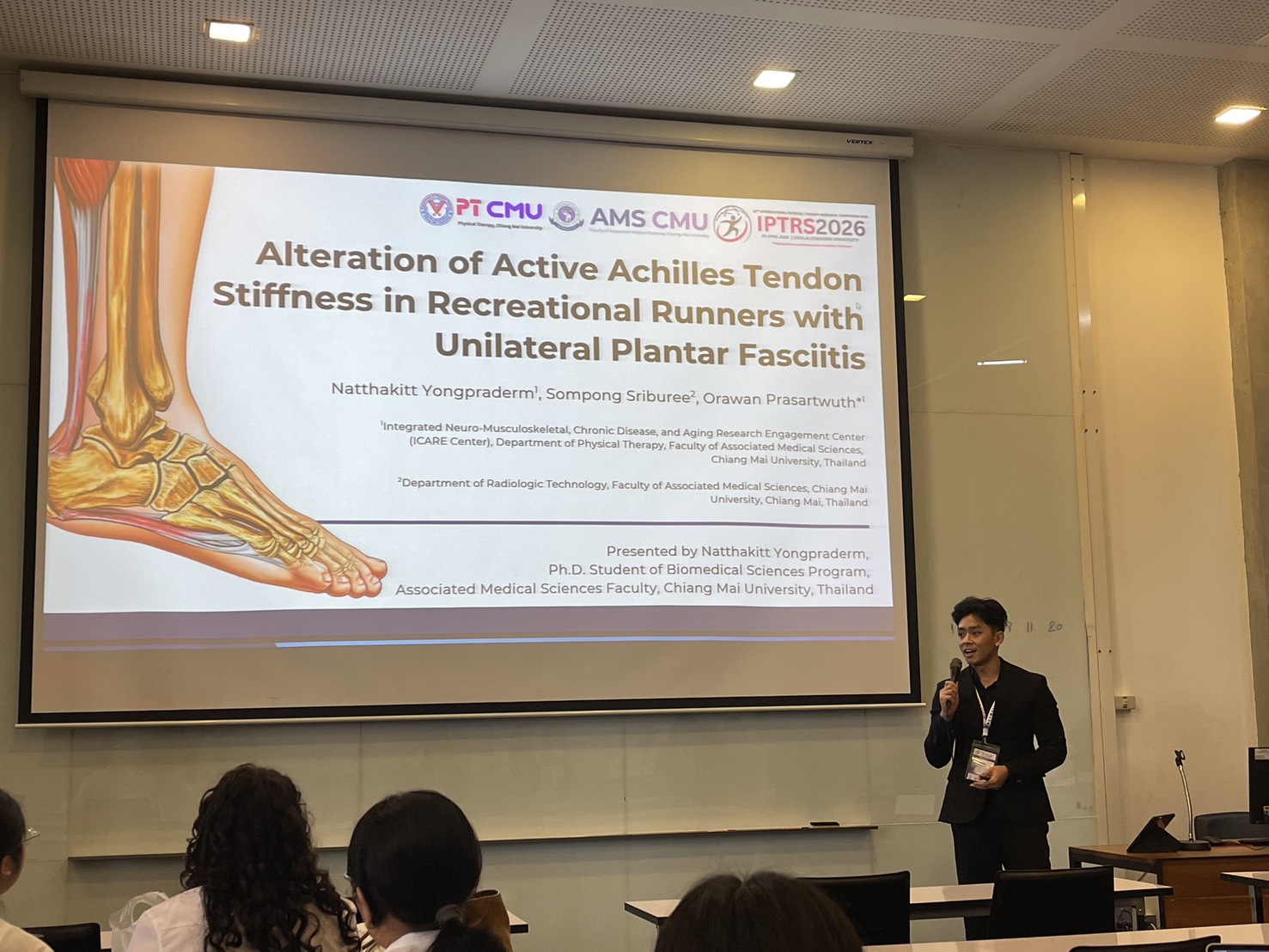 - นายณัฐกิตติ์ ยงประเดิม นักศึกษาระดับปริญญาเอก หลักสูตร Biomedical Sciences ได้เข้าร่วมนำเสนอผลงานวิจัย เรื่อง "Alteration of Active Achilles Tendon Stiffness in Recreational Runners with Unilateral Plantar Fasciitis" ภายใต้การควบคุมดูแลของ รองศาสตราจารย์ ดร.อรวรรณ ประศาสน์วุฒิ โดยมี รองศาสตราจารย์ ดร.อาทิตย์ พวงมะลิ เป็นอาจารย์ที่ปรึกษา