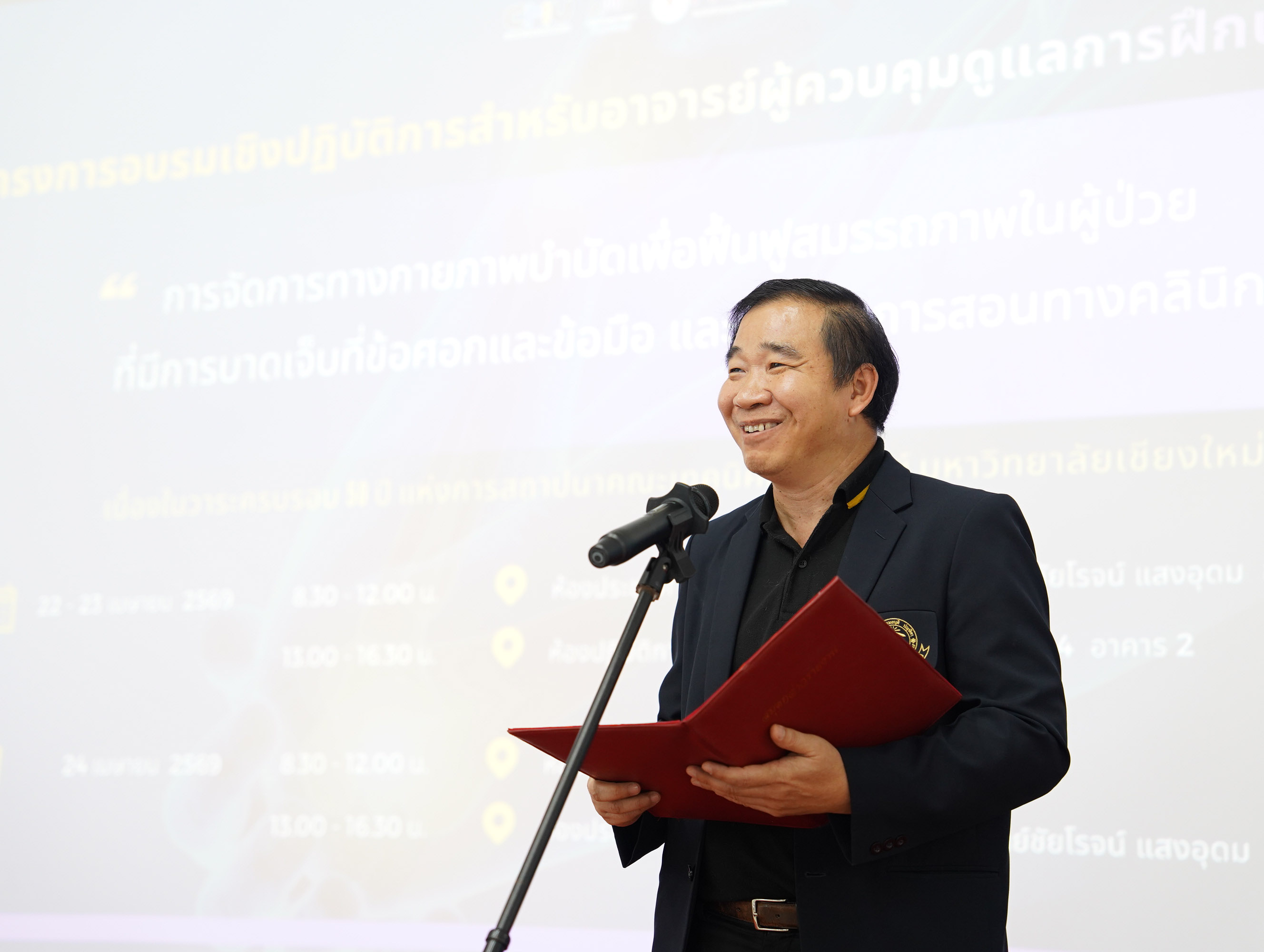 ภาควิชากายภาพบำบัด คณะเทคนิคการแพทย์ มหาวิทยาลัยเชียงใหม่ จัดการอบรมเชิงปฏิบัติการหัวข้อ “การจัดการทางกายภาพบำบัดเพื่อฟื้นฟูสมรรถภาพในผู้ป่วยที่มีการบาดเจ็บที่ข้อศอกและข้อมือ และเทคนิคการสอนทางคลินิก” โดยได้รับเกียรติจาก ศาสตราจารย์ (เชี่ยวชาญพิเศษ) ดร.สาคร พรประเสริฐ คณบดี เป็นประธานในพิธี